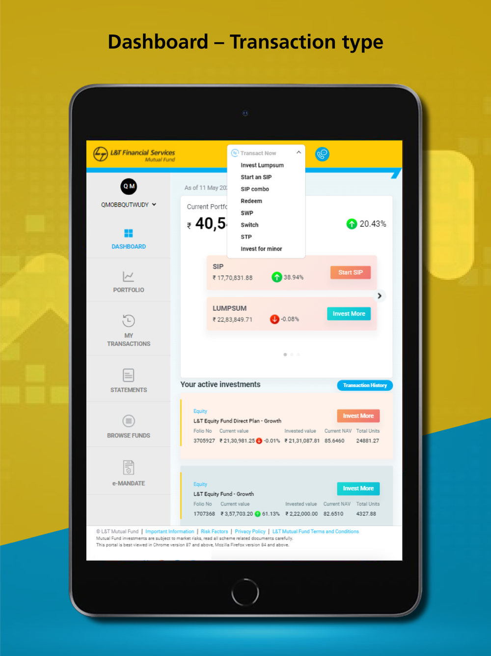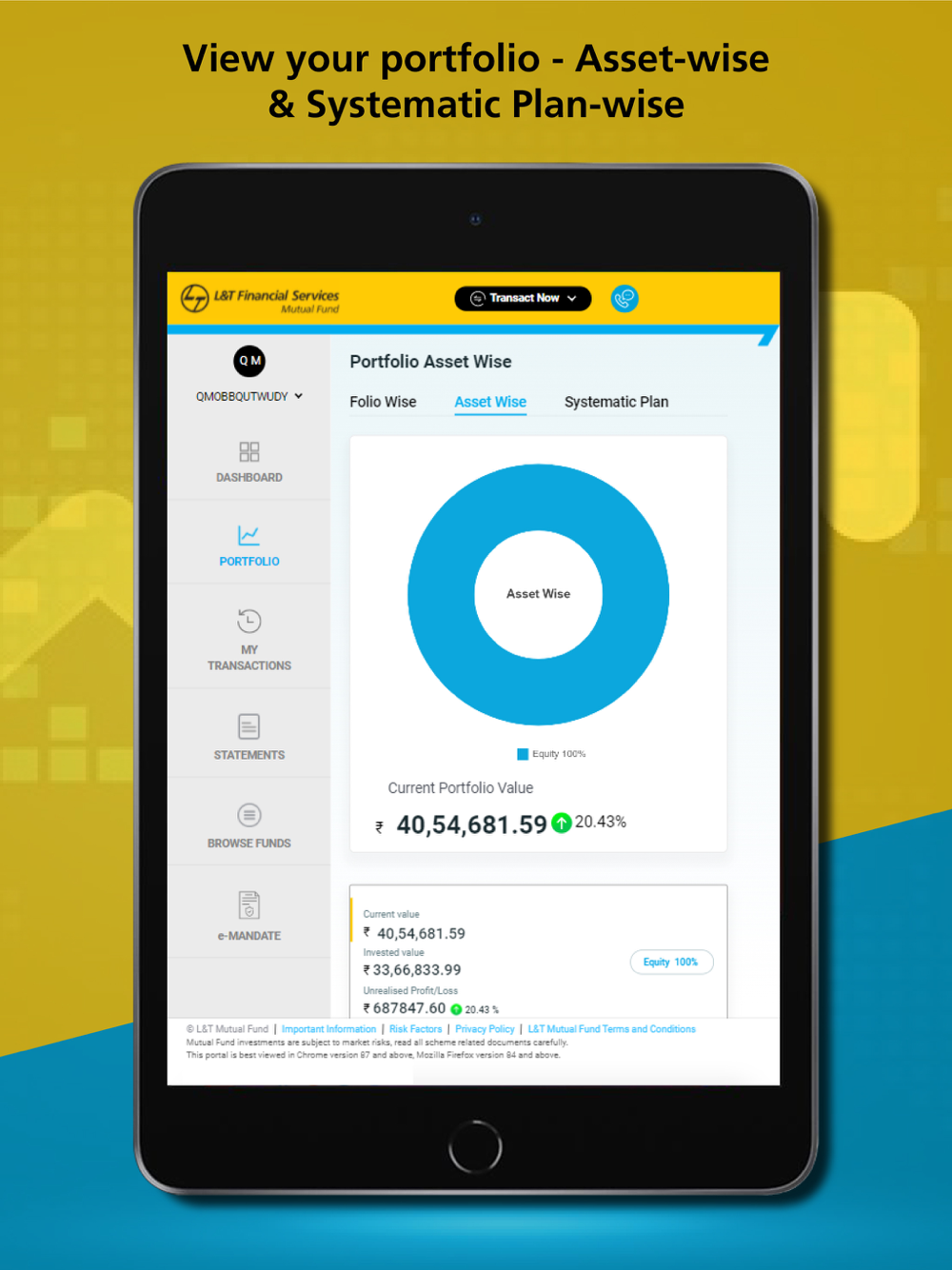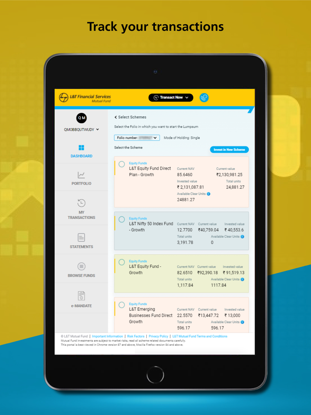 3.) No re-registration required. Existing online investors of L&T Mutual Fund can use their current website credentials to manage their investments through the app.