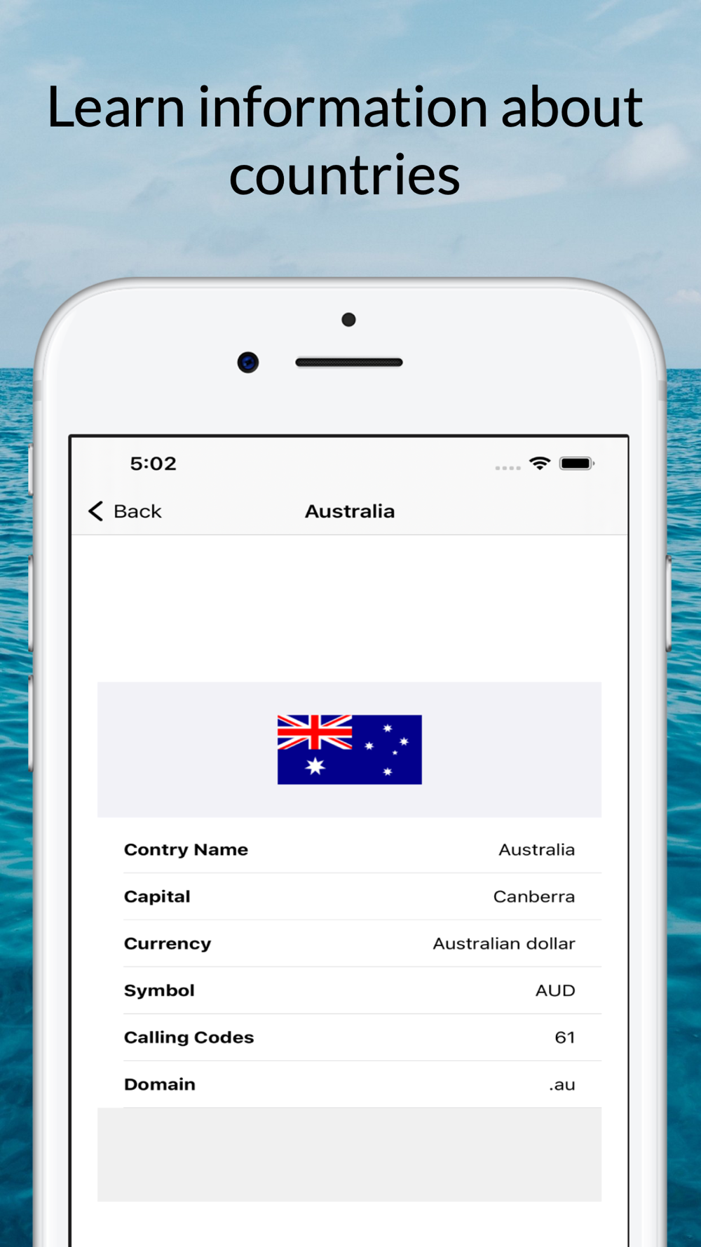 An App where you can learn what you're curious about Australia Countries You can refresh your knowledge by solving tests on country flags capitals of country and currency.