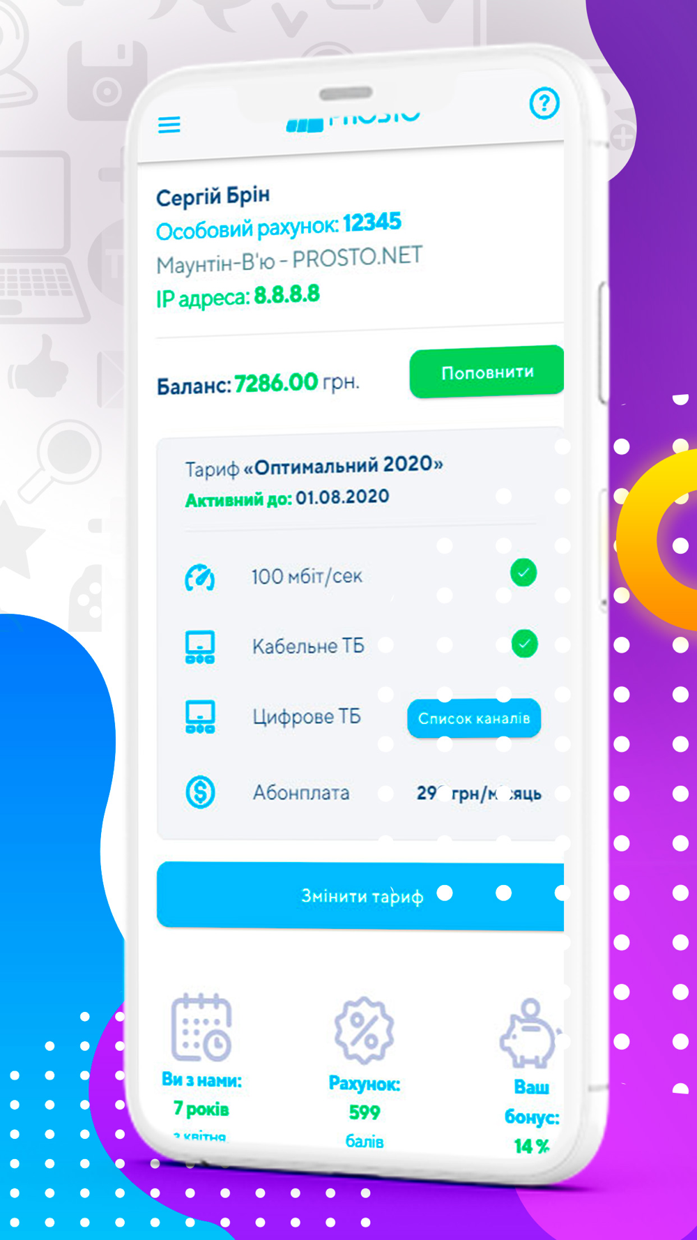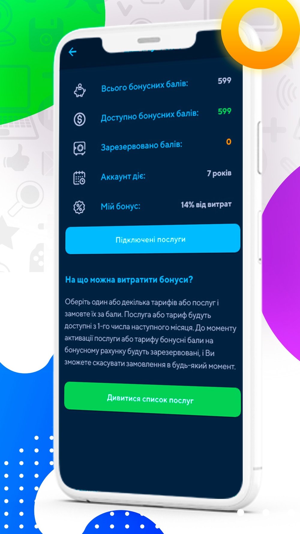Ваш помічник, який завжди у Вашому телефоні. Додаток допоможе вам знати актуальний стан вашого основного та бонусного рахунку, сплачувати за послуги в один клік не виходячи з дому та інше.
