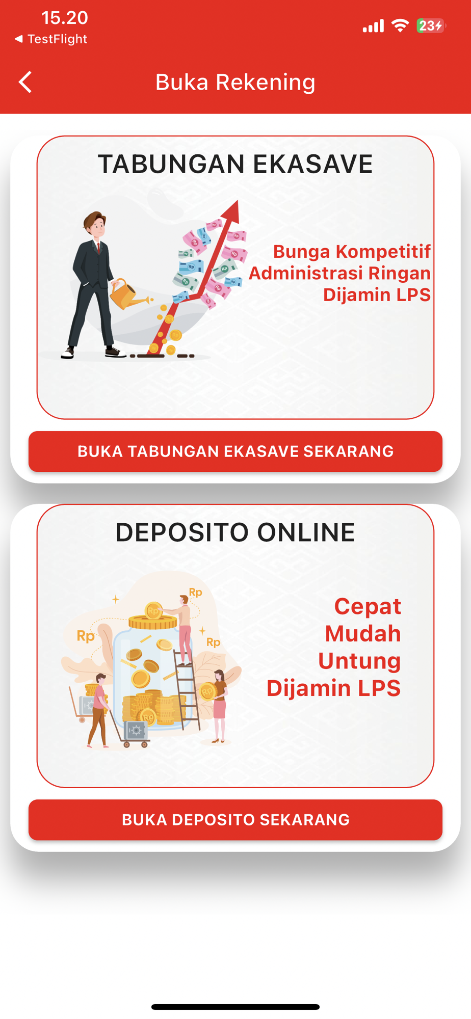 Fitur Baru Eka Online versi 1.6.3 : 1. Pembukaan Rekening Tabungan Ekasave2. Pembukaan Rekening Deposito Online3. Penambahan Blokir Kartu ATM di Halaman Utama4. Perubahan Tampilan Halaman Utama5. Penambahan Halaman Security Awareness6. Penyesuaian Alur Aktivasi7. Penyesuaian Tampilan Pilihan Metode Transfer