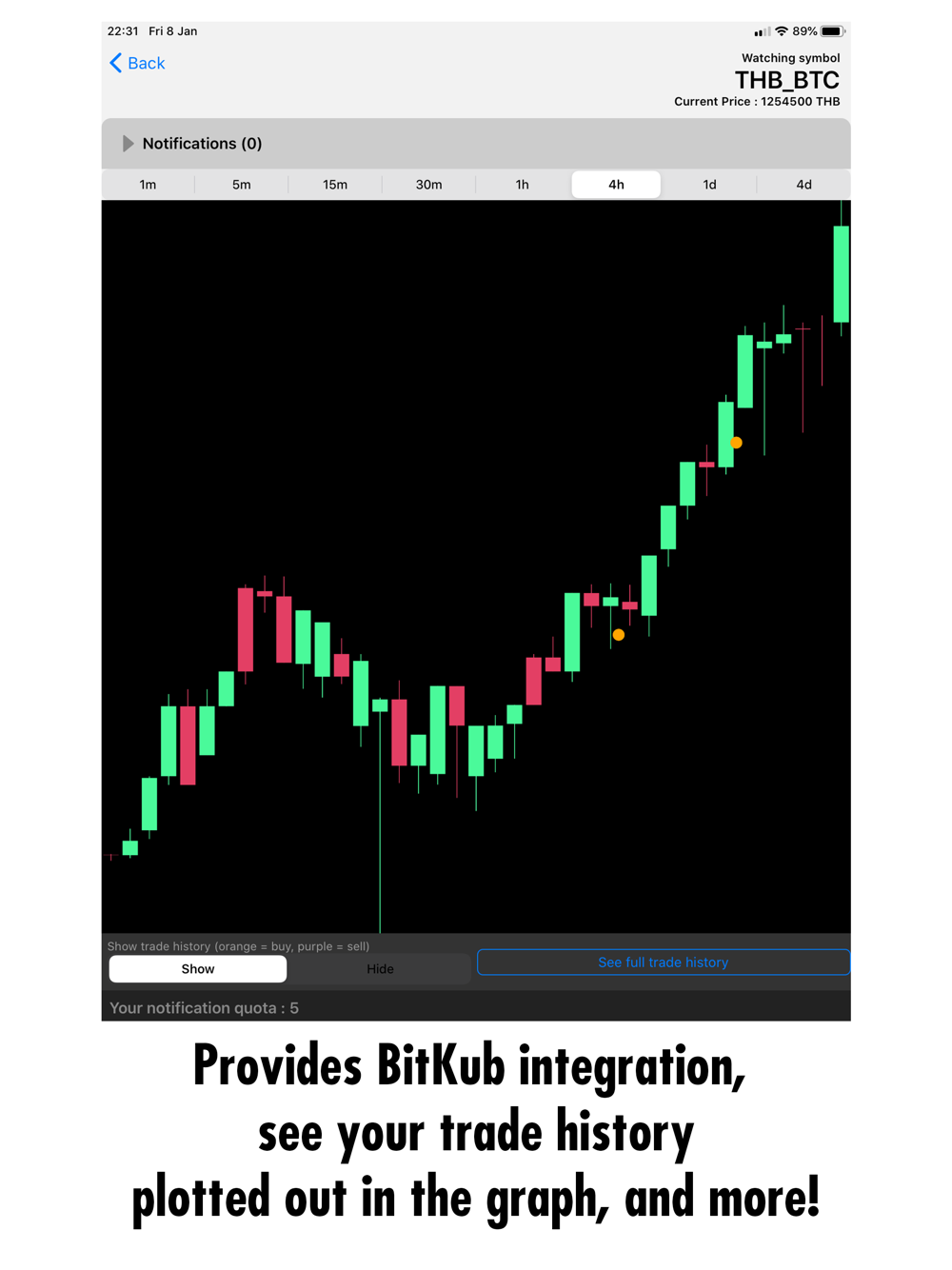 BitKub Integration allows you to view previous BUY/SELL decisions you made, plotted on graph, and also view your previous trades, summarized with ease.