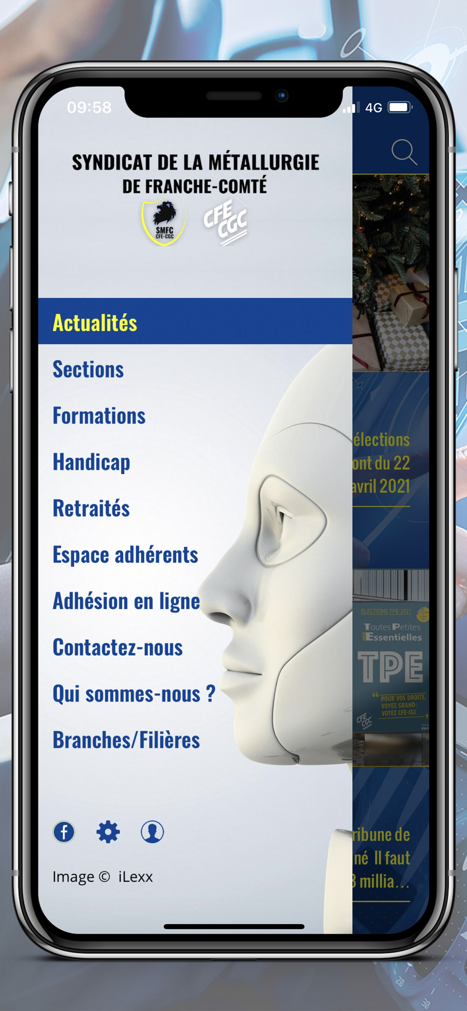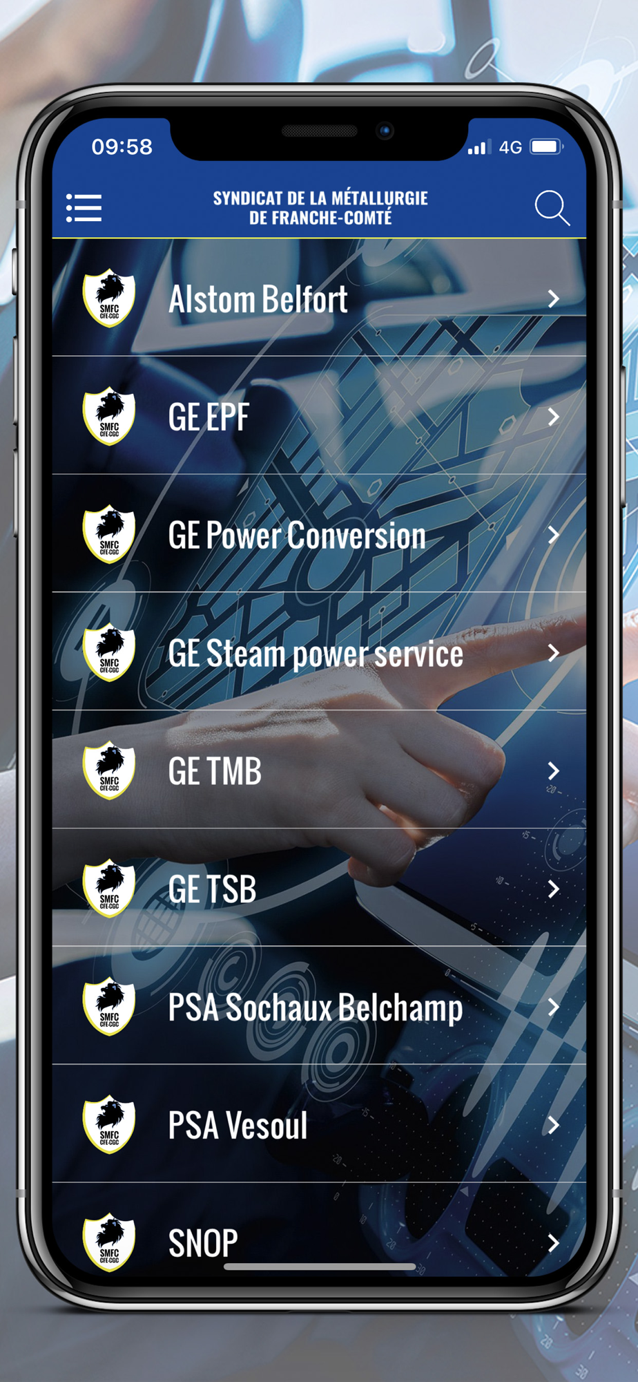 Actualités, Formations, Handicap, retraite, contact, espace dédié à nos adhérents. L'application de la métallurgie de Franche Comté CFE-CGC vous donne les informations pour suivre et décrypter l'actualité régionale ou nationale. Force de proposition, apolitique, combatif, nous sommes là pour vous aider. Techniciens, Agents de Maîtrise, Ingénieurs ou Cadres : si vous voulez rester connecté au monde du travail, vous investir dans la vie syndicale, si vous avez besoin d'un contact, de conseil, d'aide : cette application est faite pour vous. A bientôt. L'équipe du SMFC.