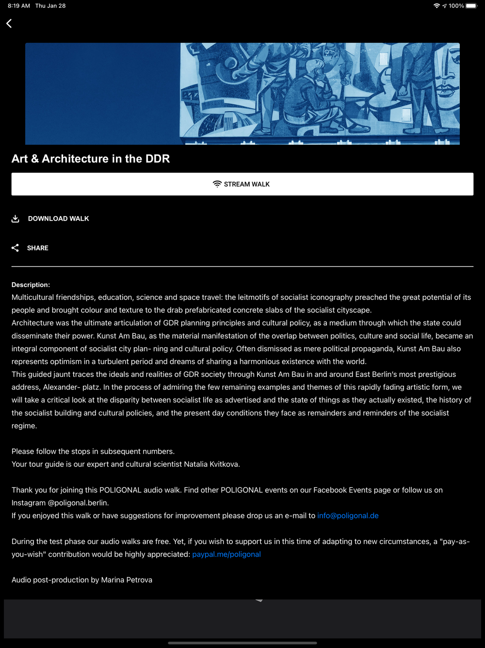So, put your earphones on and let DRIFTER be your acoustic compass guiding you through the city. Have fun strolling through urban space in a new way and expand your knowledge by jumping on one of our audio-guided walks. They are packed with thoroughly researched information with commentary by experts from various disciplines, loaded with authentic testimonies, and enriched with voices from locals.