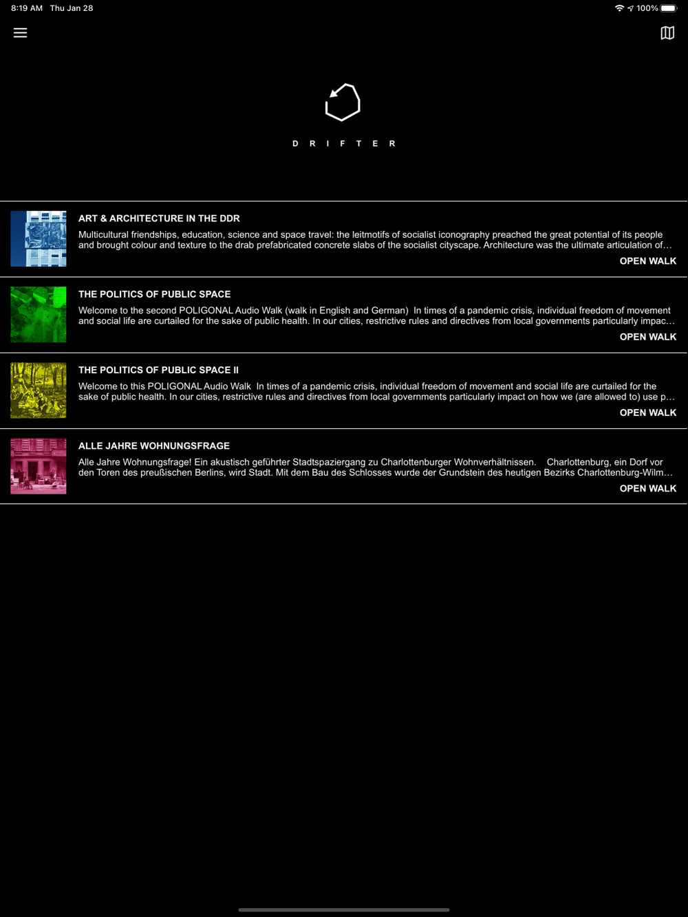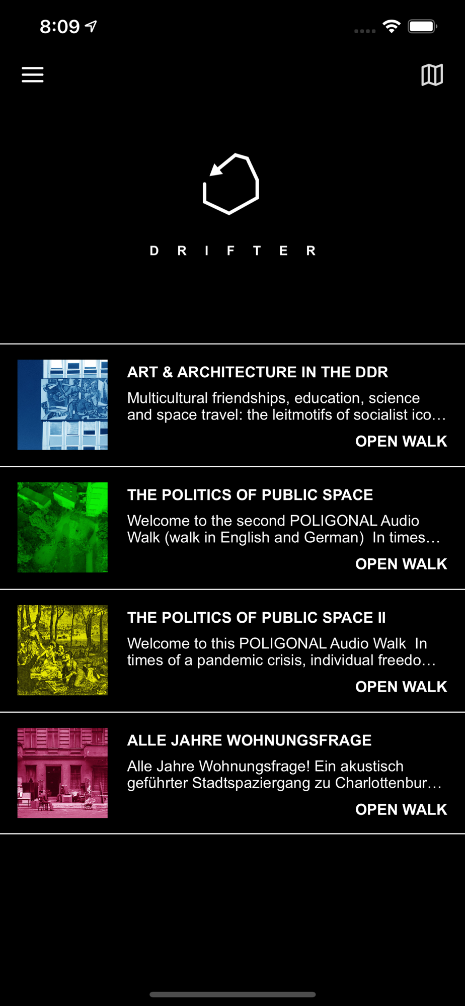 DRIFTER is a companion with which to explore urban space in Berlin and beyond. In audio-walks covering themes like the city’s architecture, urban transformation processes, and everyday life, the app leads you to unknown places, reveals unheard stories and sets the scene for unexpected encounters.