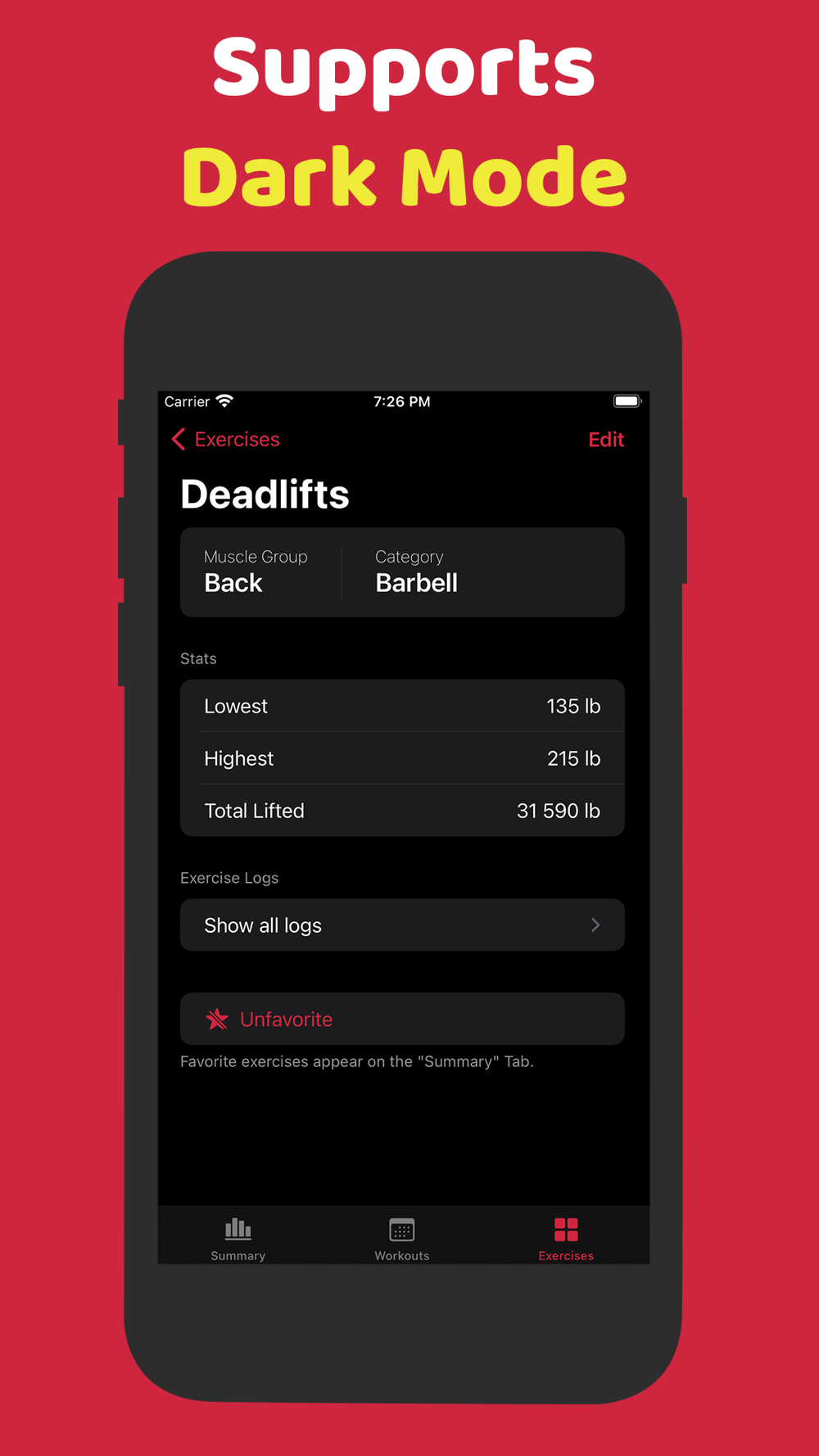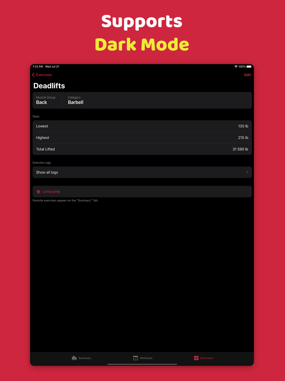 The app comes preloaded with 100+ exercises, which are common within a typical gym. Each exercises are categorized by muscle group (i.e. back, chest, legs) and by category (i.e. dumbbells, kettlebells, barbells). You can edit these and you can also add new exercises. The exercise detail page also groups all logs ever entered for that exercise, as well as fun stats like the max lift and min lift.