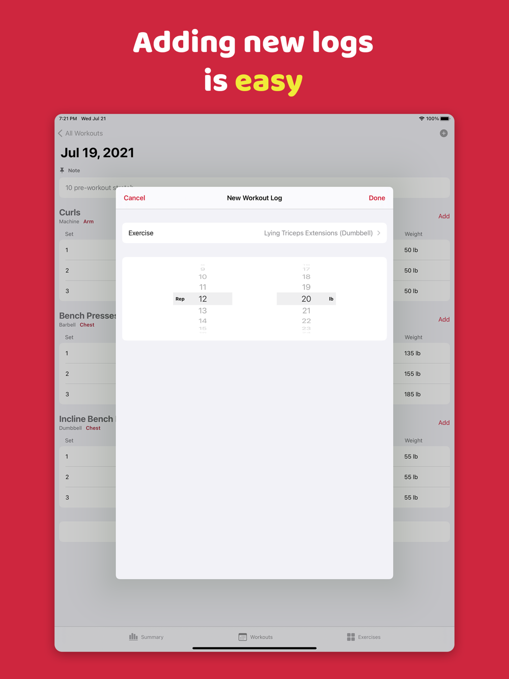 Use the app to log all your workouts. Adding logs is quick and simple, perfect while resting in-between sets. Each log consists of an exercise, the weight used and the amount of repetition. All logs are grouped by exercise in a given workout session, giving you a clear summary of your workout.