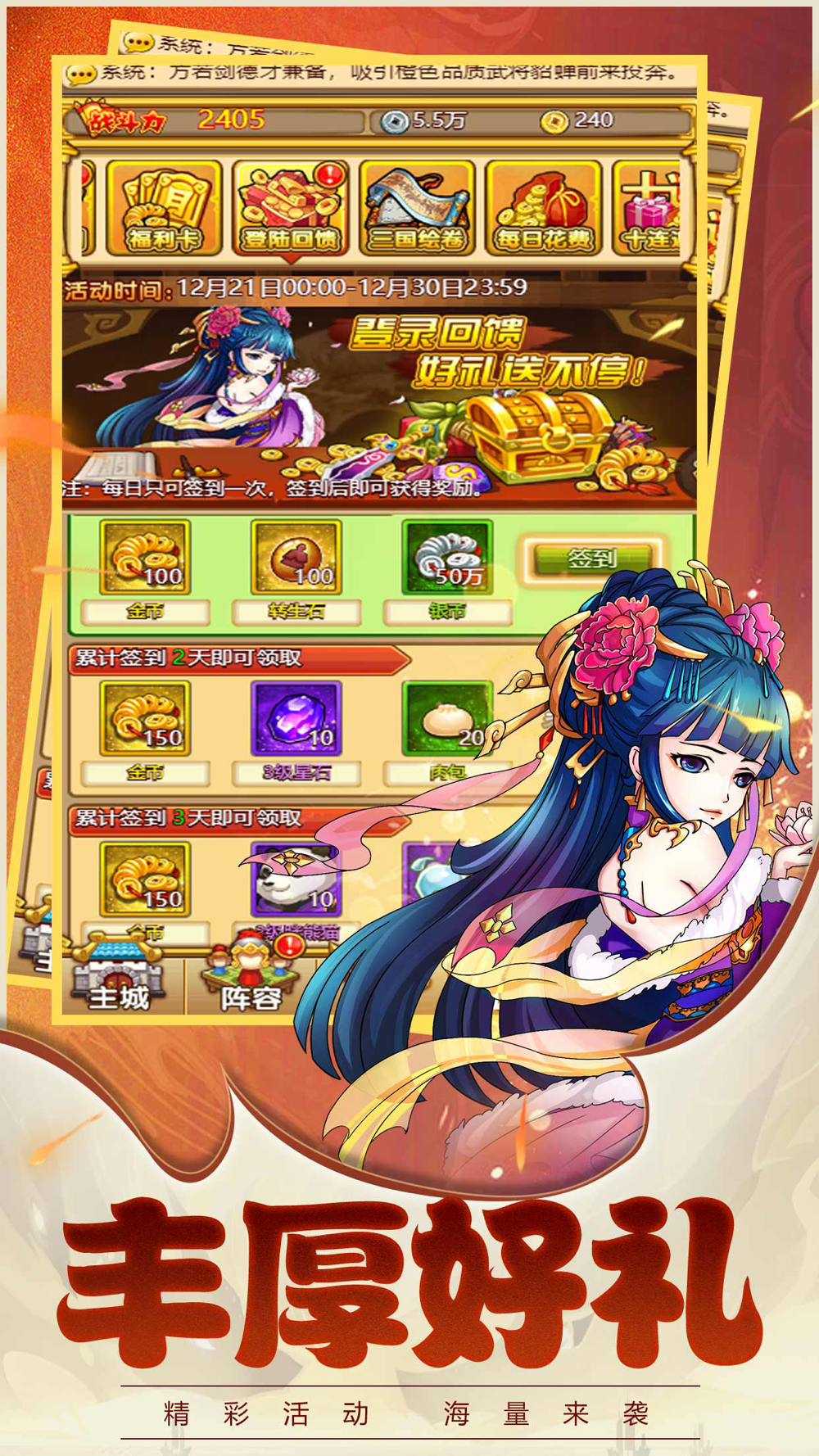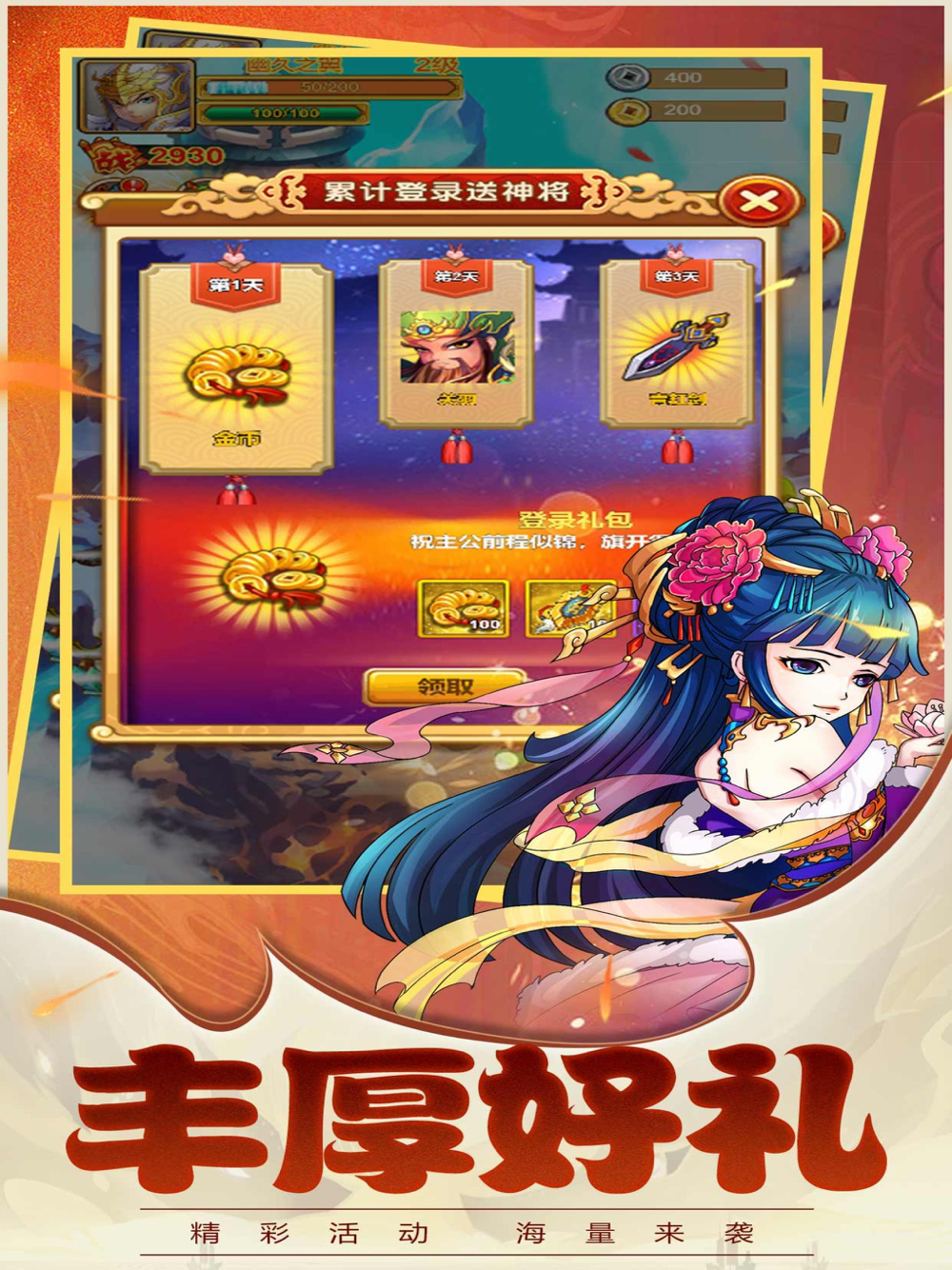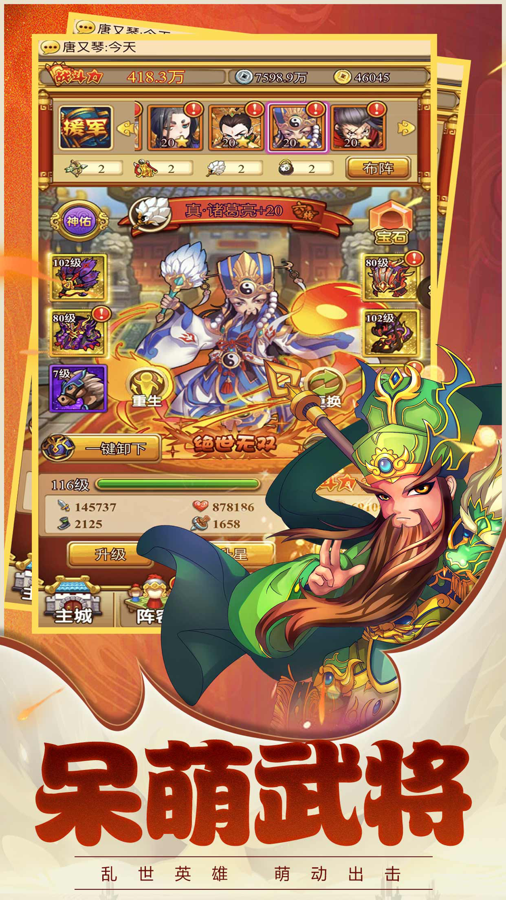 【萌系人物 二次元精制】 新增全新卡牌角色 ,近两百张卡牌,全新重绘武将角色与NPC对话,更Q更萌,对话诙谐,爆笑不停,更流行的游戏元素。 【地图丰富 百余卡牌】 缘起黄巾之战、讨伐董卓、群雄割据、官渡之战、赤壁之战等场景,招募诸葛亮、吕布、赵云、貂蝉等神将将神兵,用策略与智慧守塔,一统三国!超过三百张地图,近两百余名神将神兵,百变阵容、极致策略,老少皆宜。