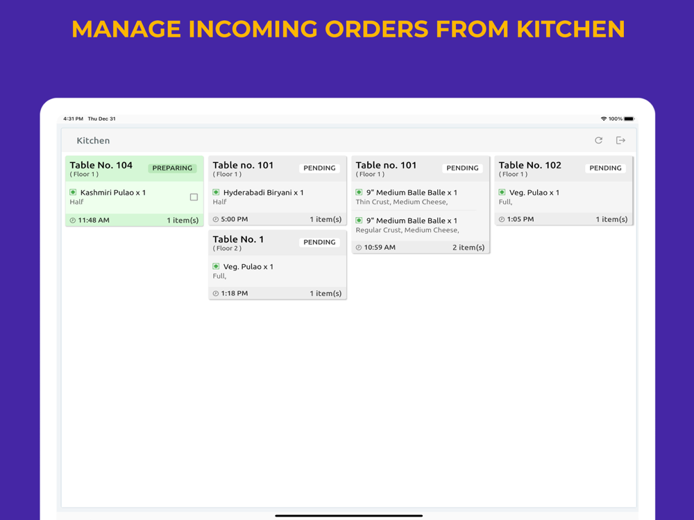 Kitchen app will provide order details with option to manage their status.