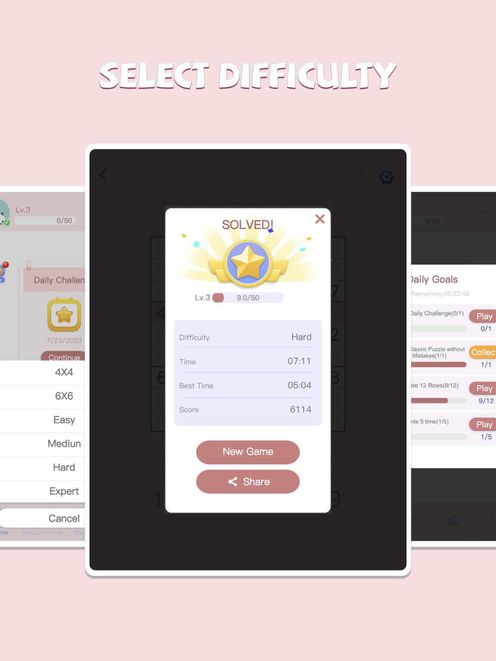 - Statistics. Track your progress for each difficulty level of sudoku puzzle, analyze your best time and other achievements.