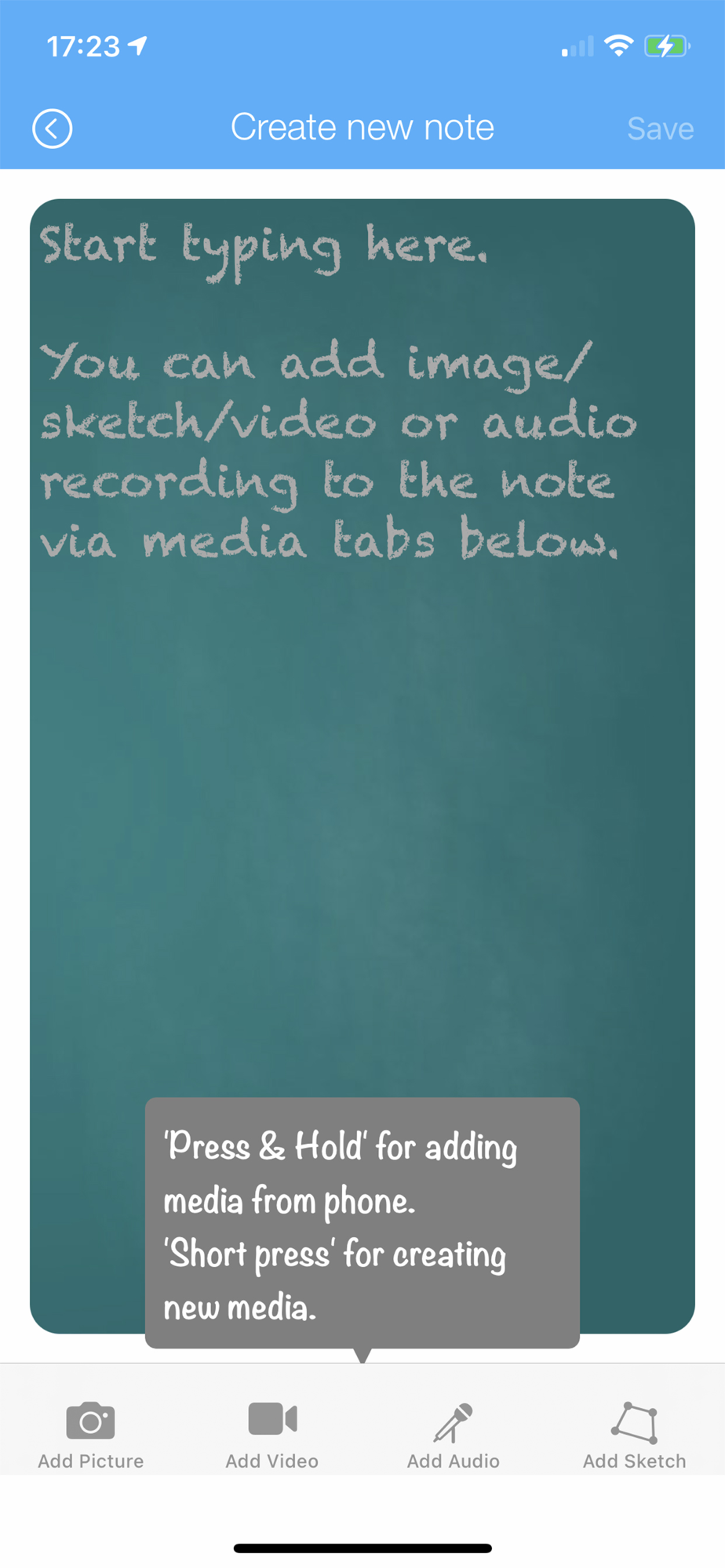 5. preview options for image/audio/video/sketch taken (before the new note is saved).