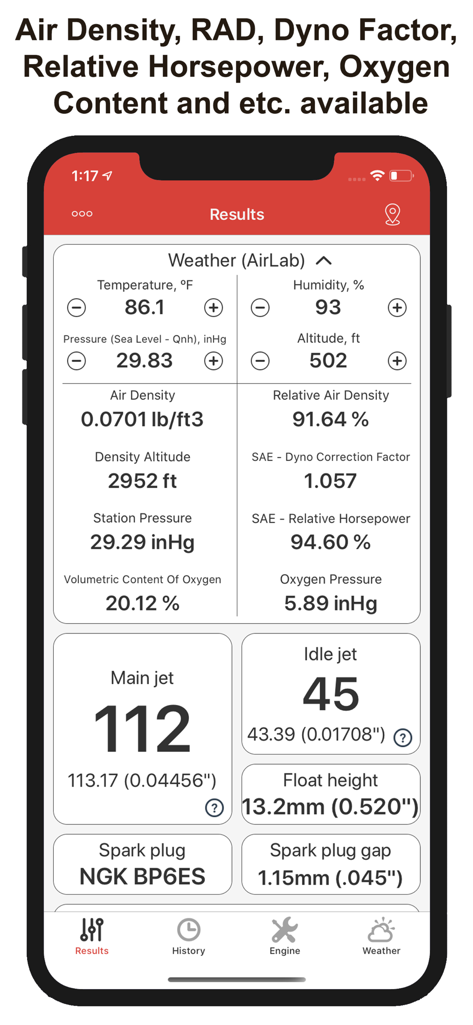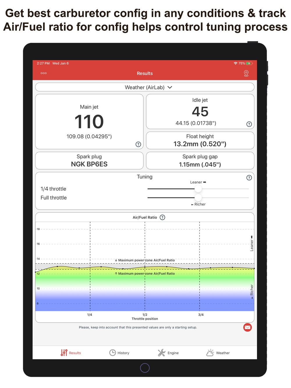 • Results: In this tab main jet size, pilot jet size, float height, spark plug, spark plug gap are shown. These data are calculated depending on the weather conditions and the engine configuration given in the next tabs.
