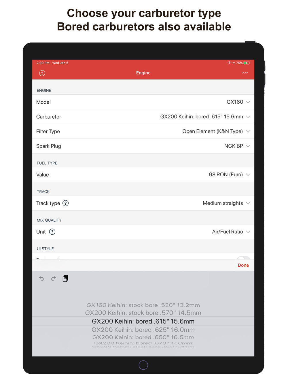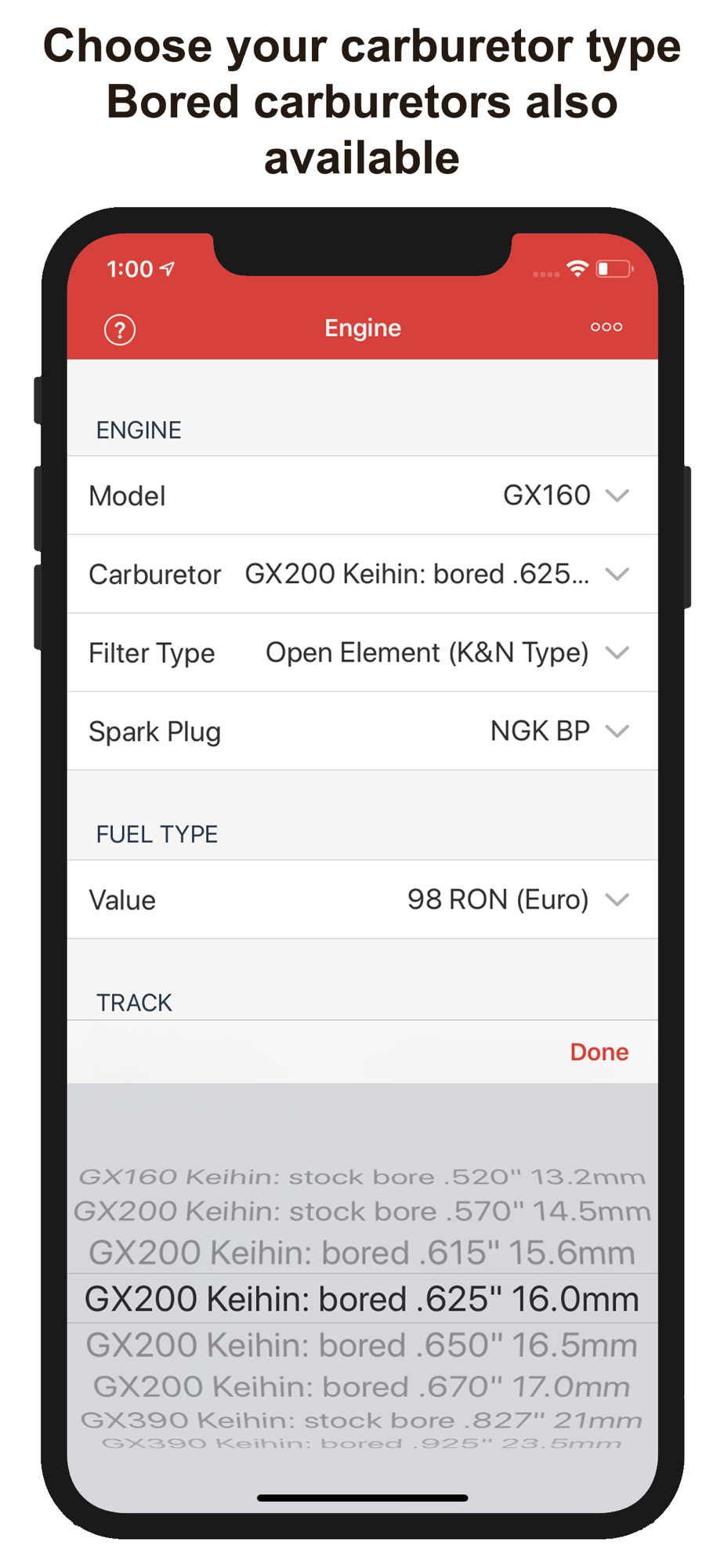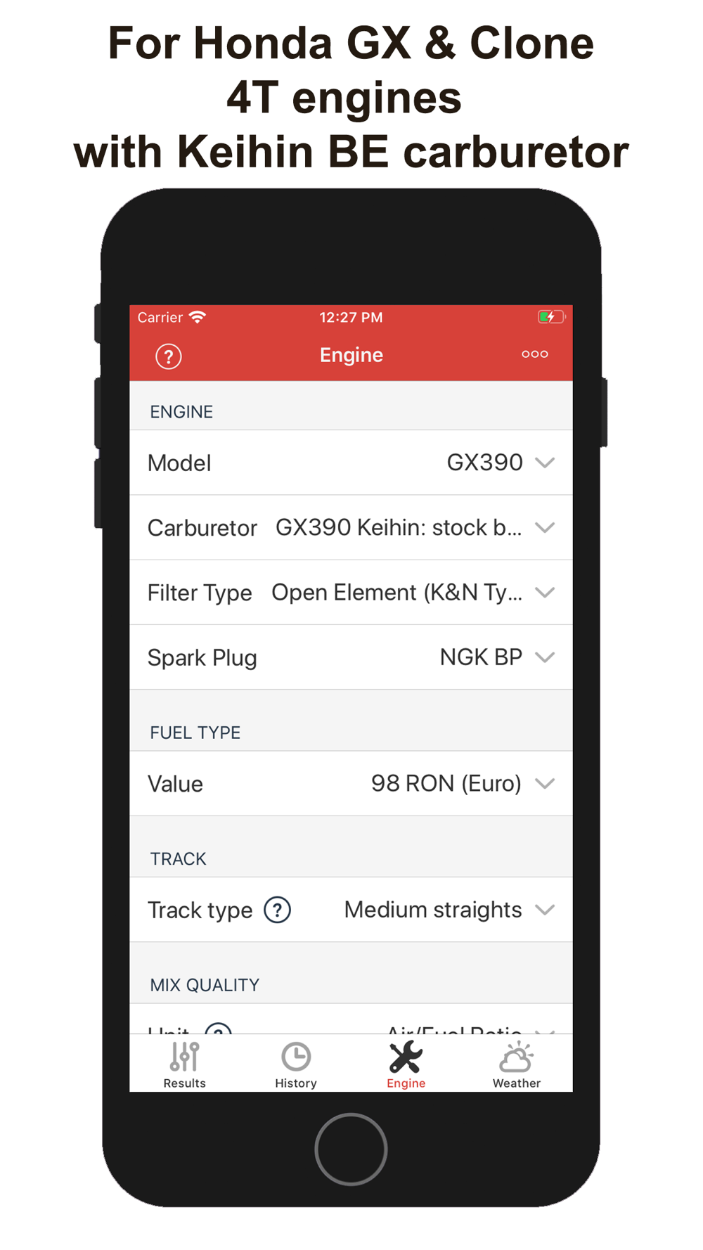 This app provides, using temperature, altitude, humidity, atmospheric pressure and your engine configuration, a recommendation about optimal carburetor configuration (JETTING) and spark plug to use for karts with Honda GX & Clone 4 stroke engines, which use a Keihin BE carburetor (stock air filter or open K&N type air filter).