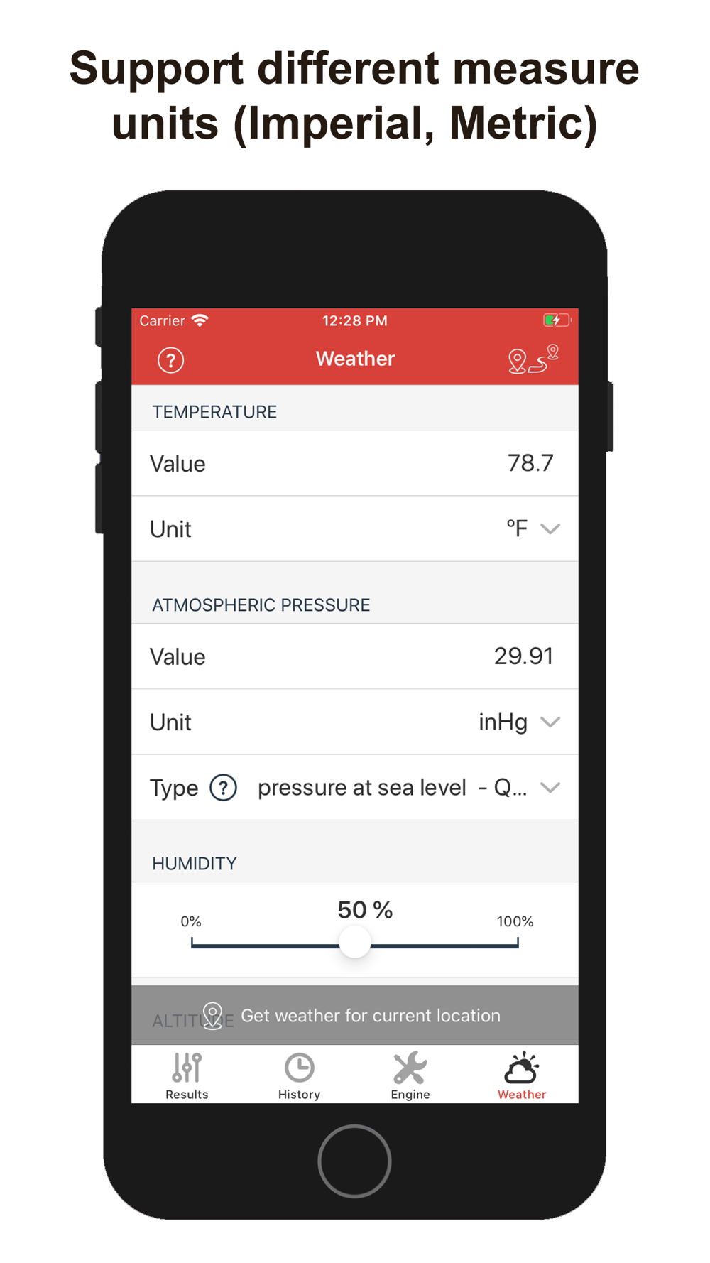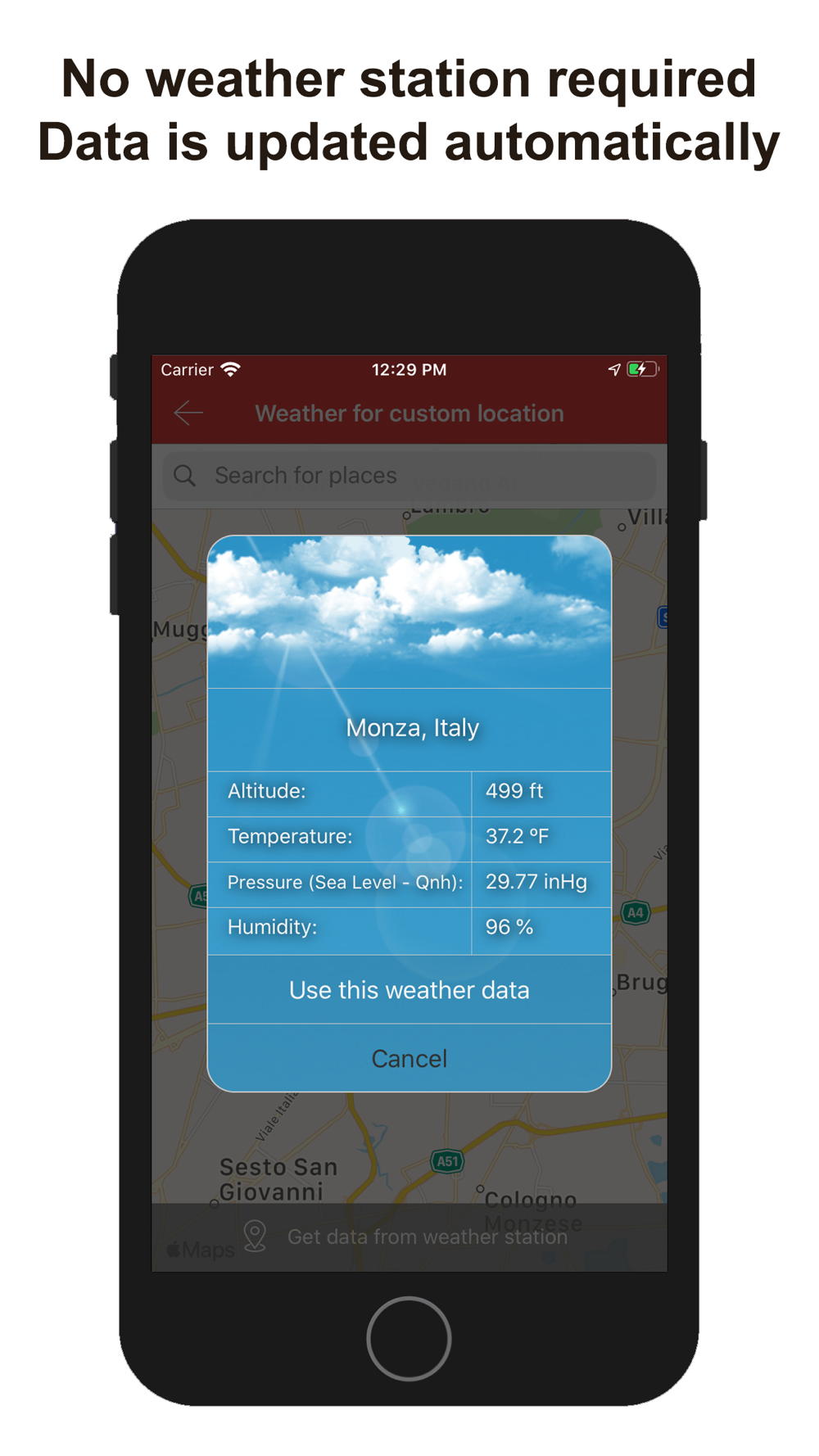 This app can obtain automatically the position and altitude to get the temperature, pressure and humidity from the nearest weather station thought internet. Internal barometer is used on supported devices for better precision. Application can run without GPS, WiFi and internet, in this case user has to enter weather data manually.