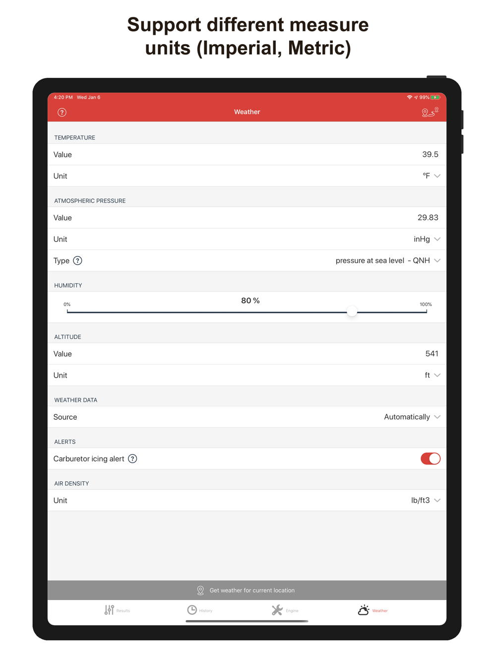 • let you use different measure units: ºC y ºF for temperatures, meter and feet for altitude, liters, ml, gallons, oz for fuel, and mb, hPa, mmHg, inHg for pressures