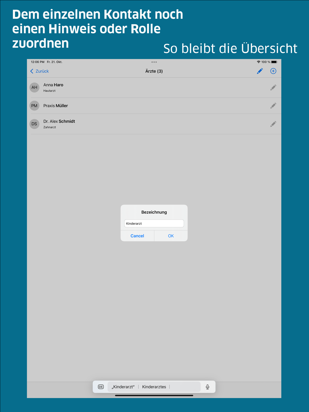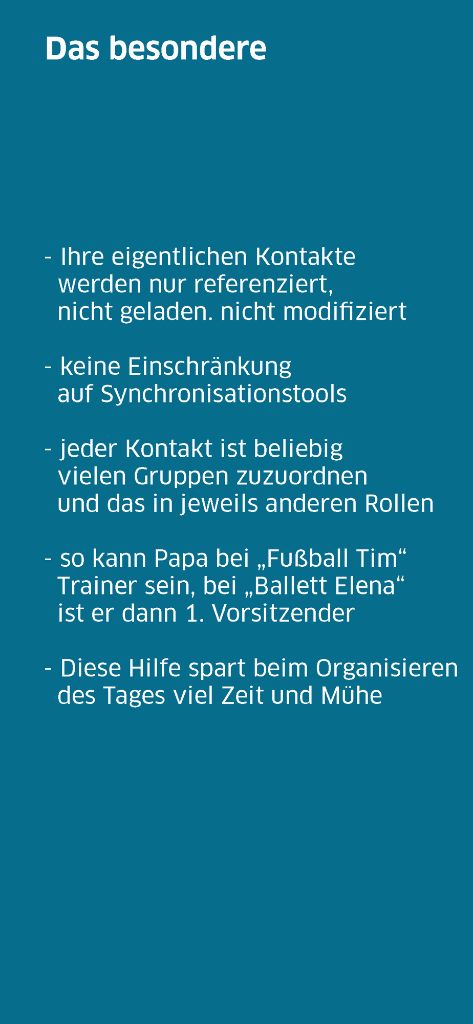 Mittels Individueller Beschriftung kannst du deinen Kontakten innerhalb einer Gruppe eine Rolle zuordnen, wie z.b. "Trainer, Zahnarzt oder Steuerberater".