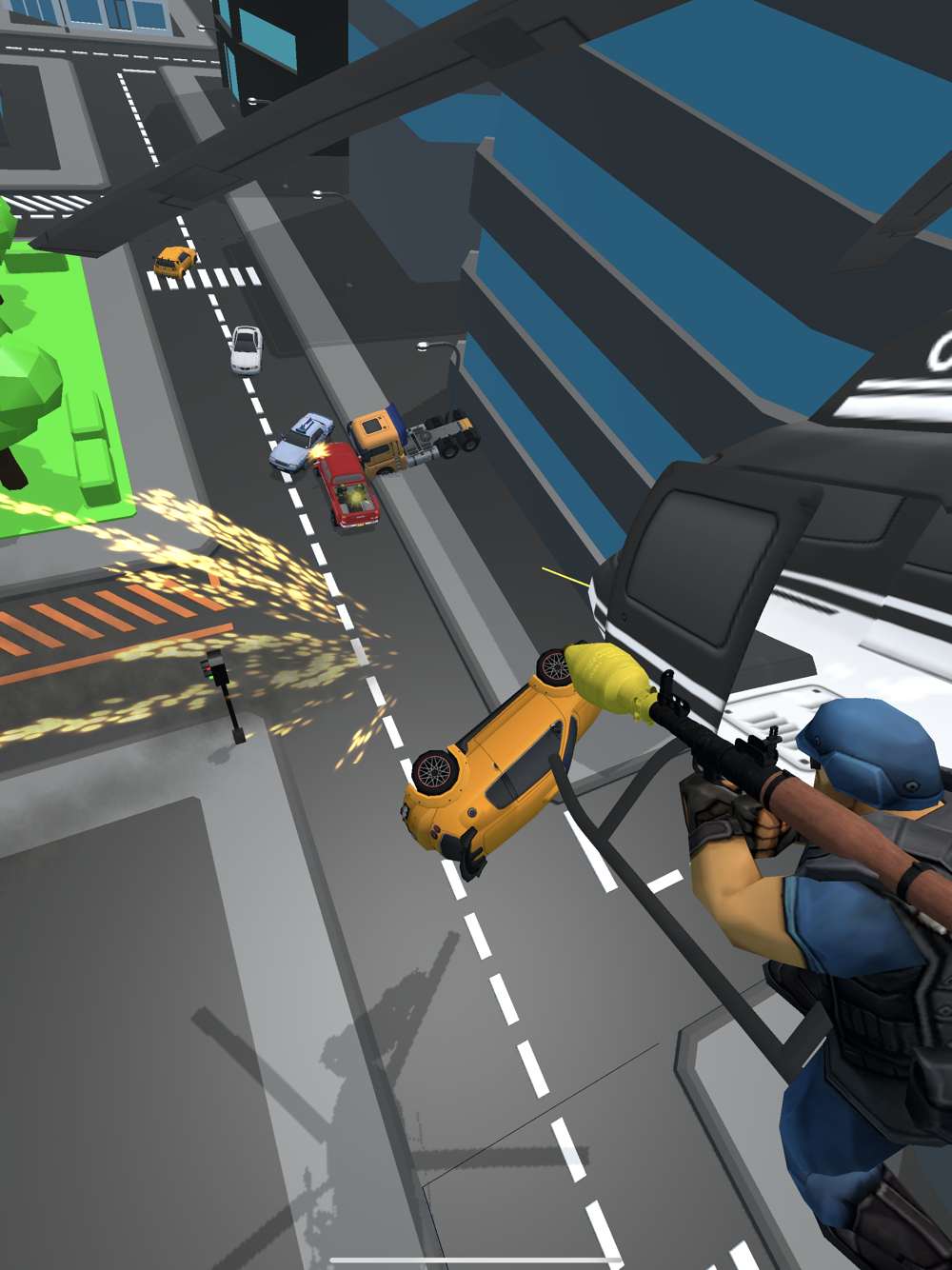 Thieves are on the run! Hurry up before they escape! Catch them and bring them to justice! Use your helicopter and firepower to stop them.