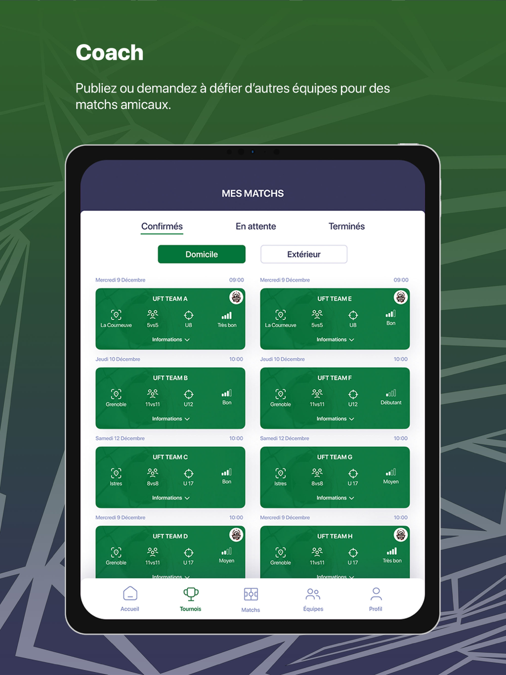 UFT est une plateforme de mise en relation entre les clubs. Notre rôle sera de vous soutenir dans la réalisation de vos tournois et de vos matchs amicaux grâce aux fonctionnalités de notre application.