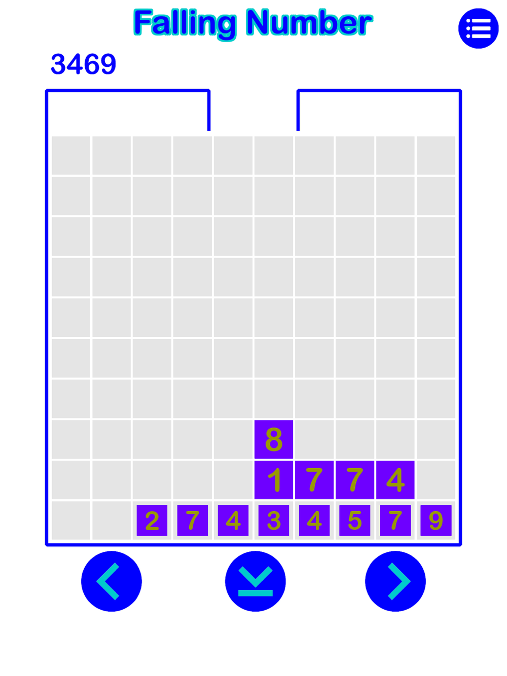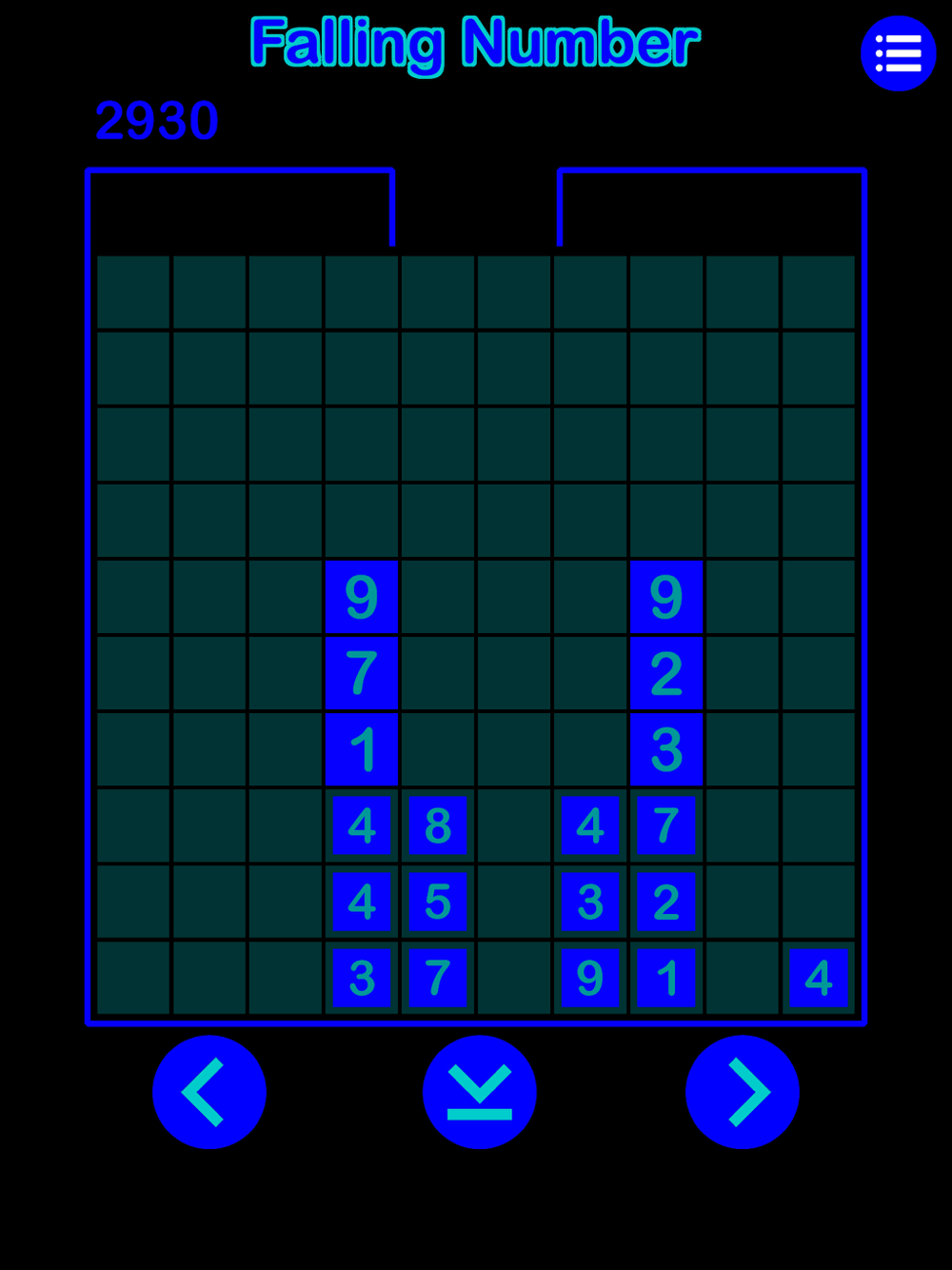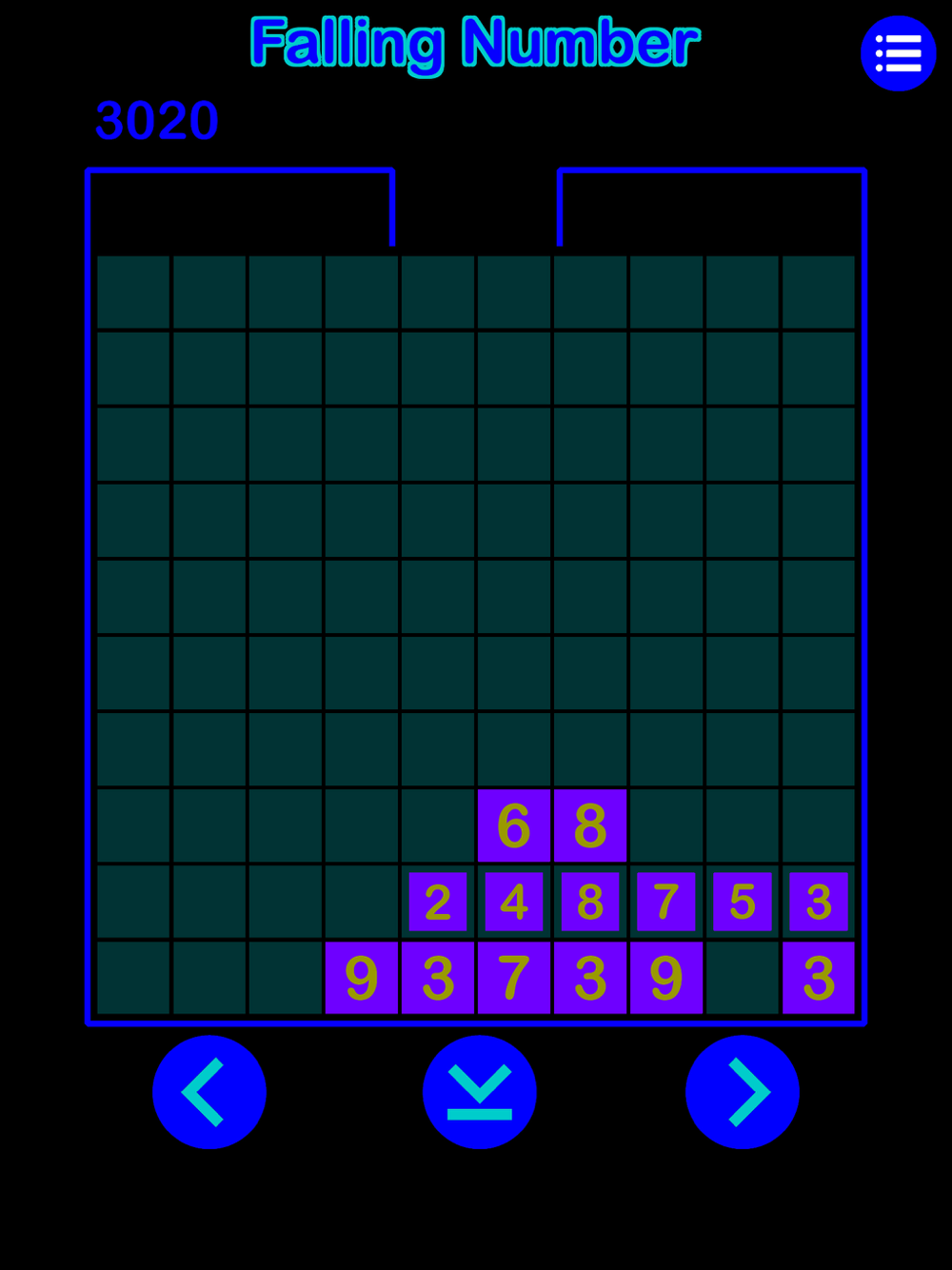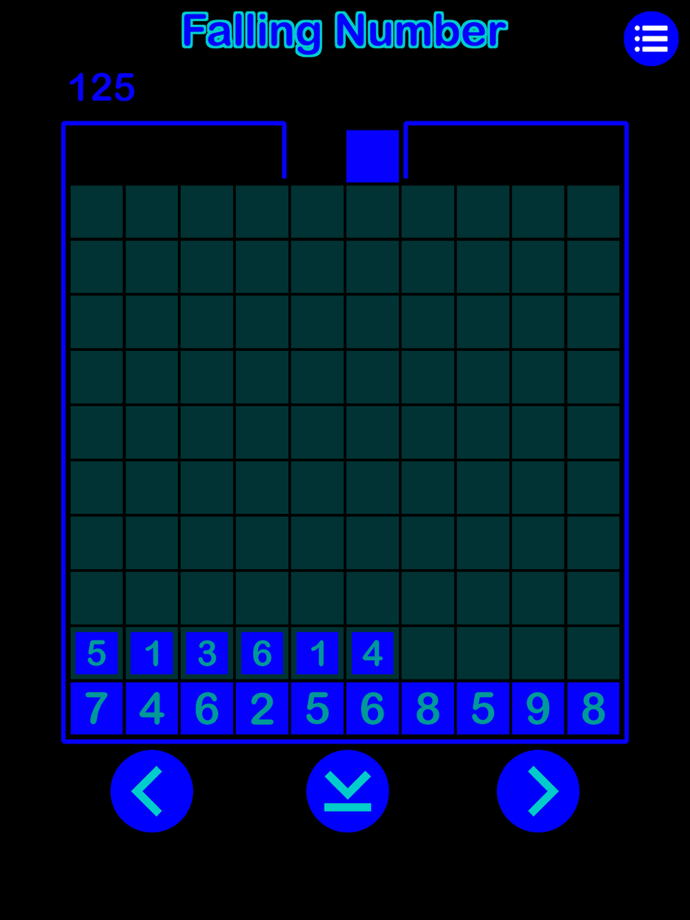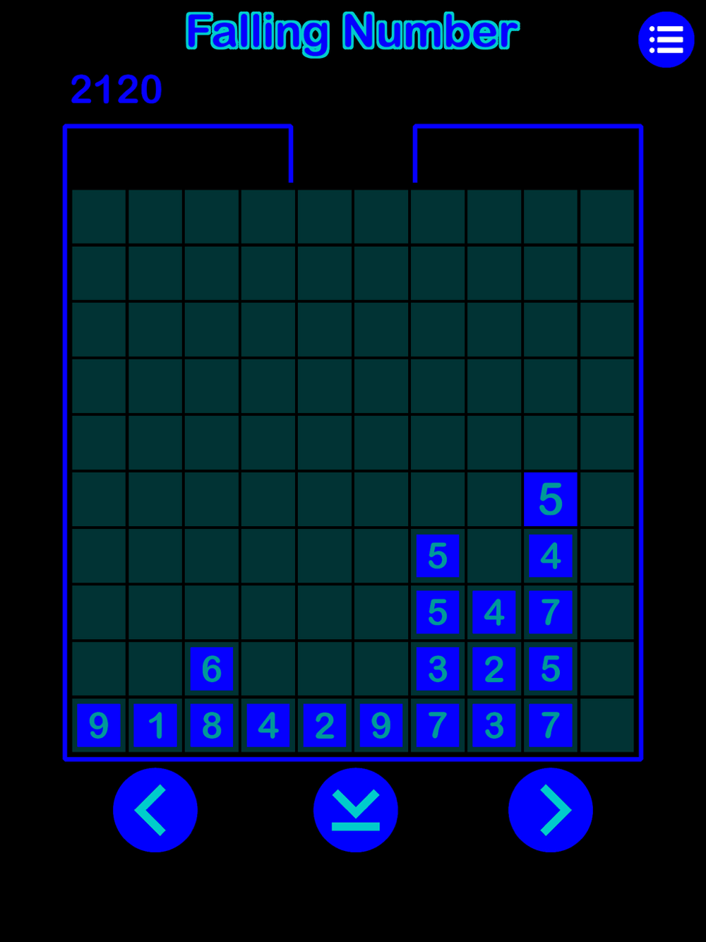 Falling Number is a light brain exercise game, not for competition. Light brain practice with single digit adding and strategically locate the falling number consecutive on row or column which have a sum that matches the selected one. The default selected sum is 20 and can be changed in the setting. It is not shown on the play screen because this is for memory practice while doing calculation and deciding location.
