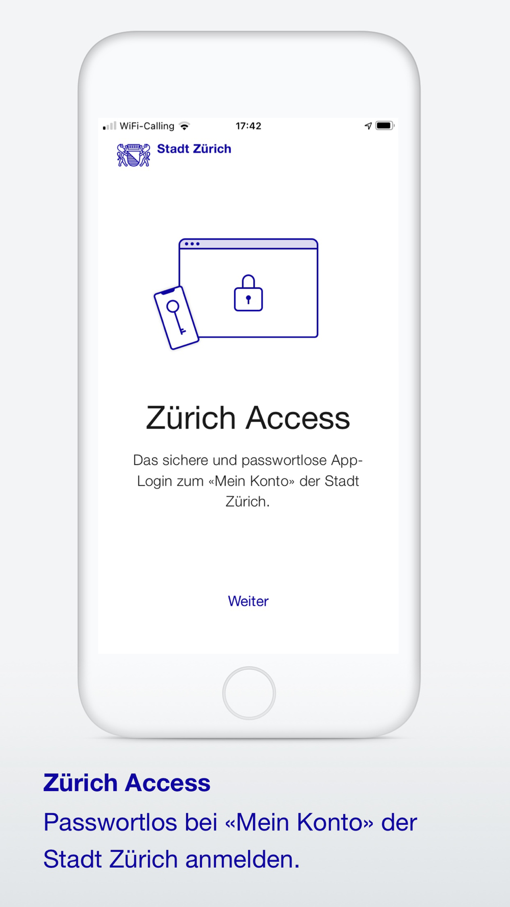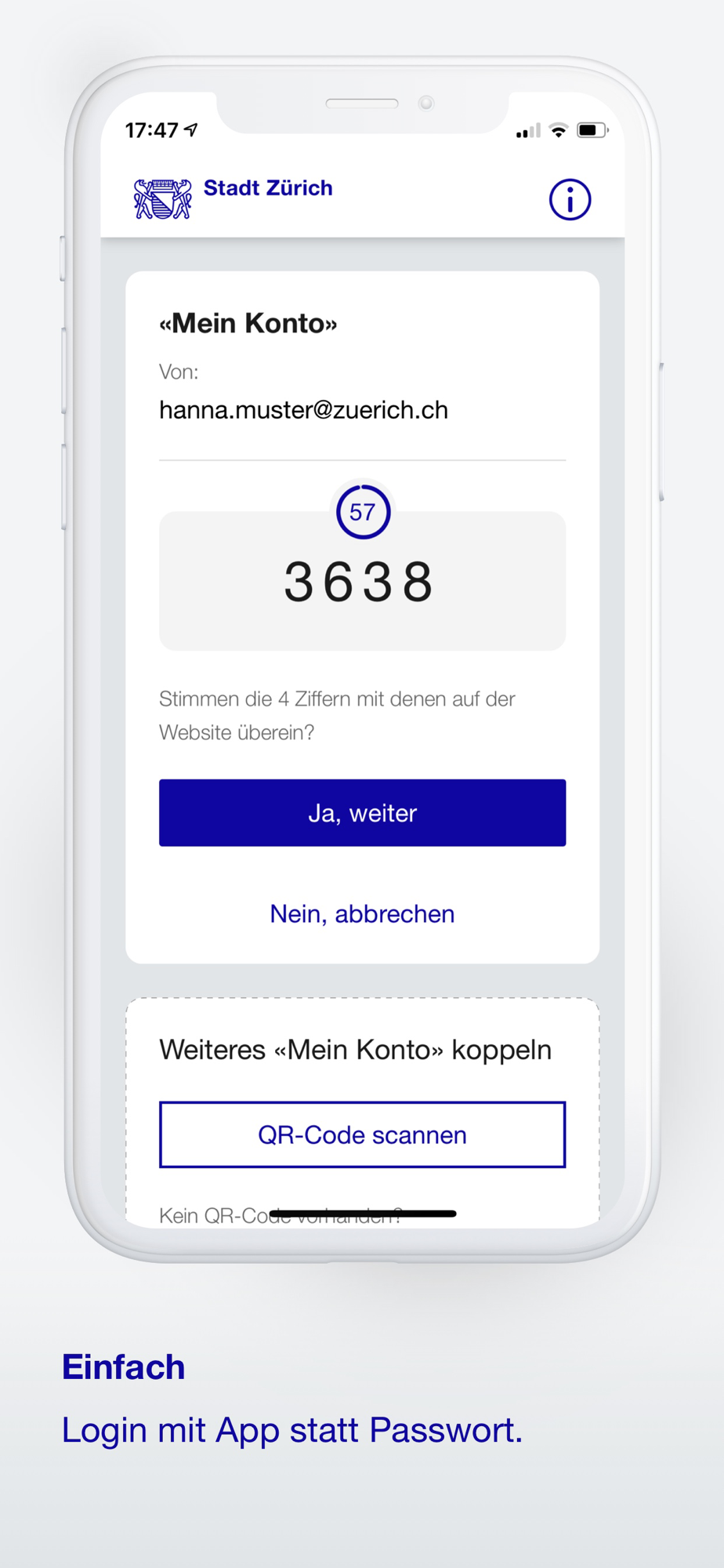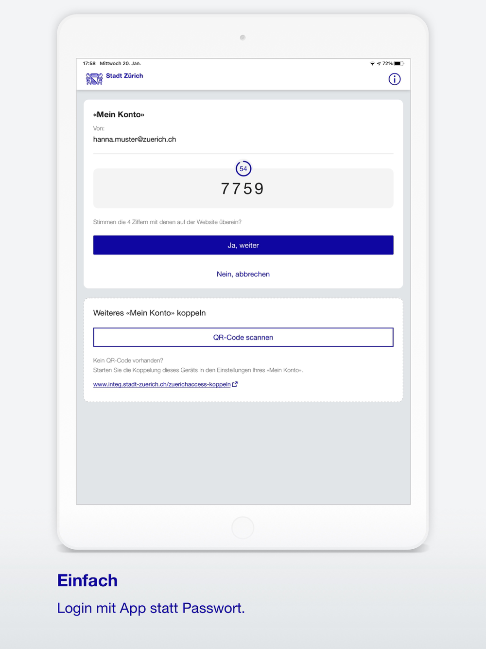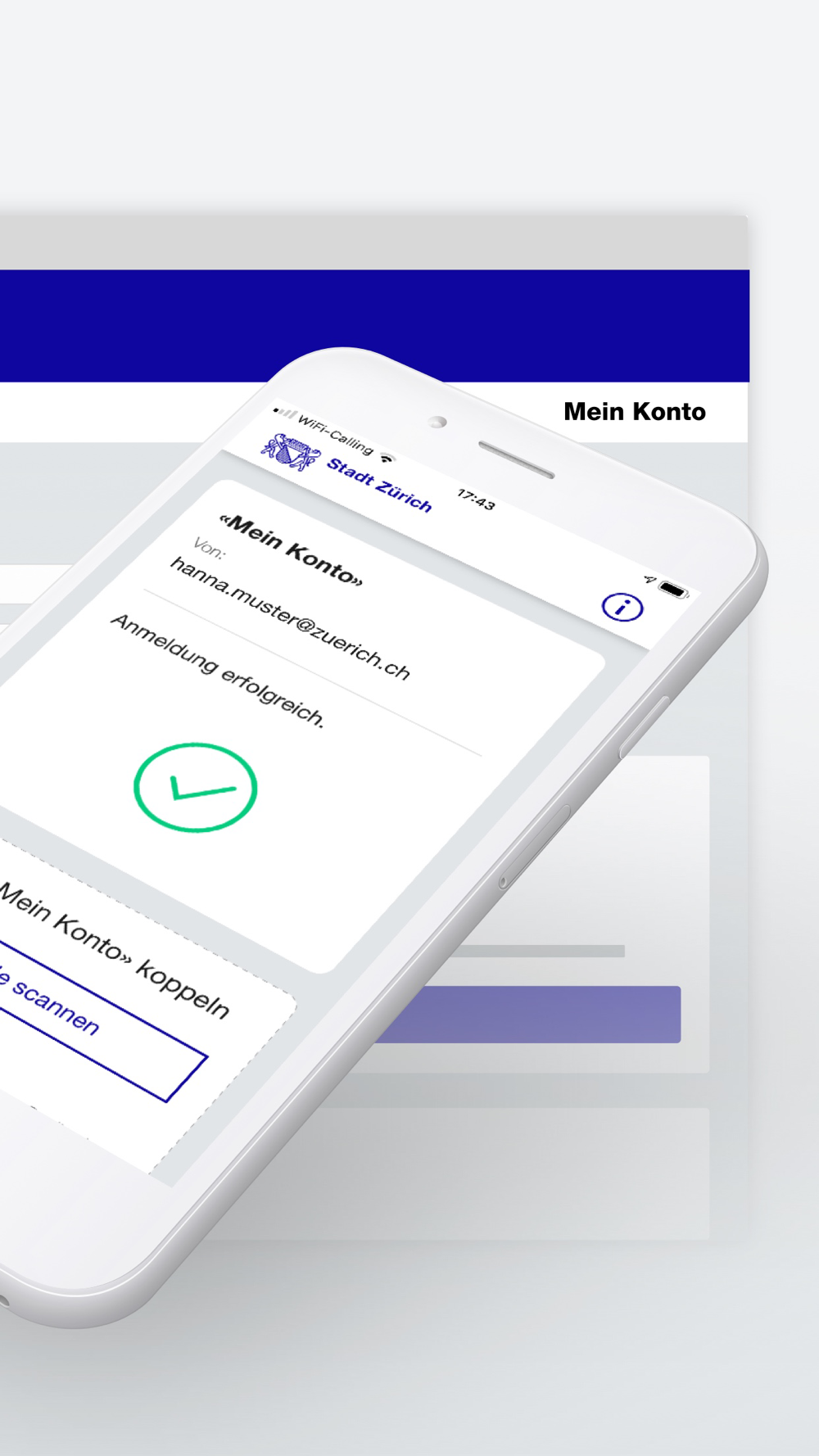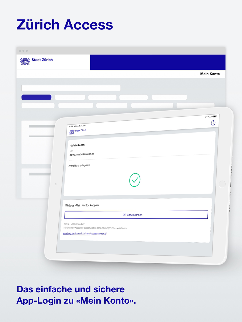 Zürich Access ist das einfache und sichere App-Login für «Mein Konto», dem zentralen Zugang zu den Online-Services der Stadt Zürich.