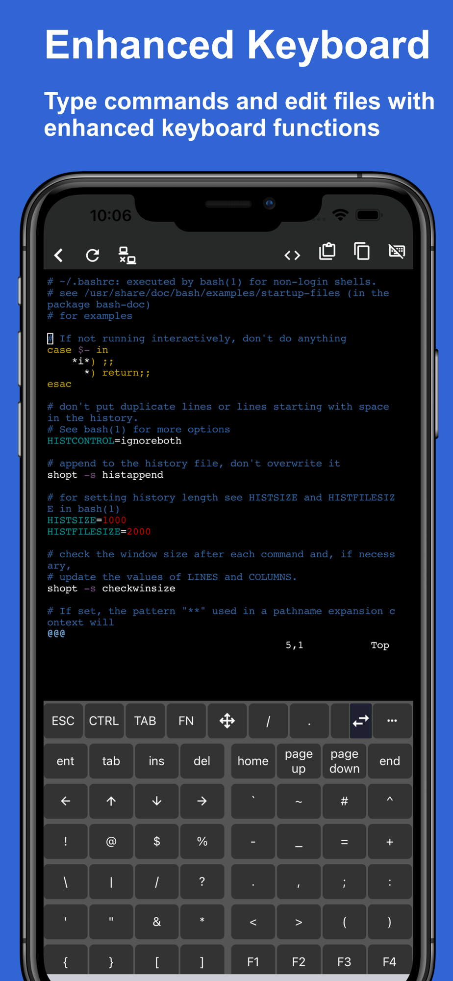 * SSH Editor. Edit files with terminal editors. Full-featured keyboard designed for mobile phones.