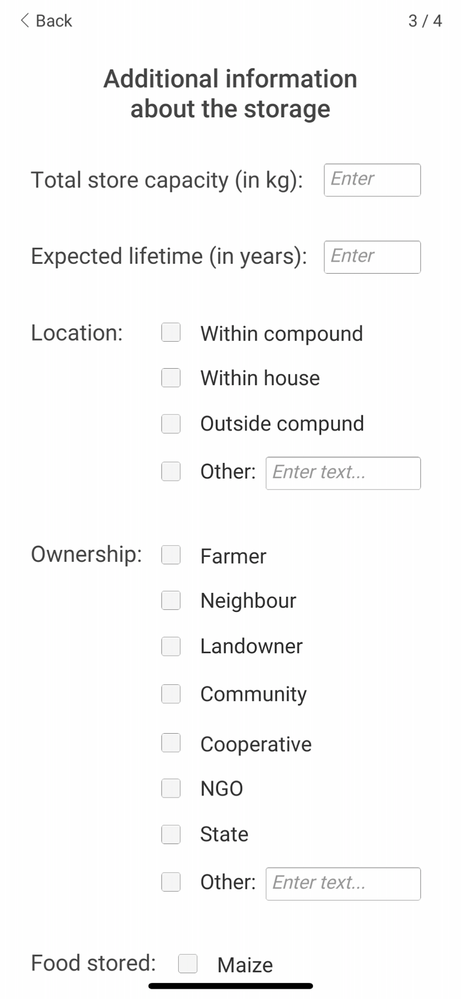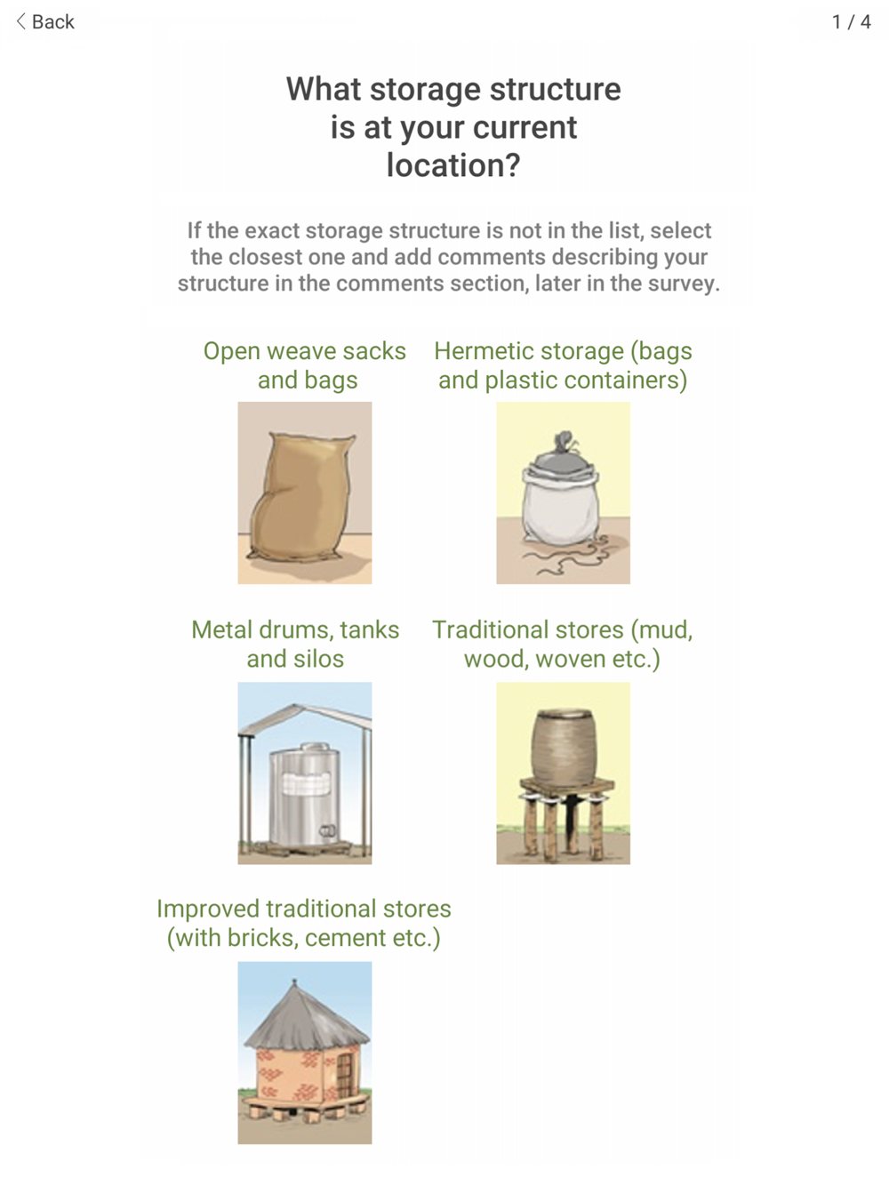 This app allows its users, once they have found a storage structure or storage site, to capture detailed information on storage structures or technology, that are mapped so the distribution of storage types can be better understood. Fill in one survey for each storage structure you locate - if a farmer has several structures, submit one survey for each.