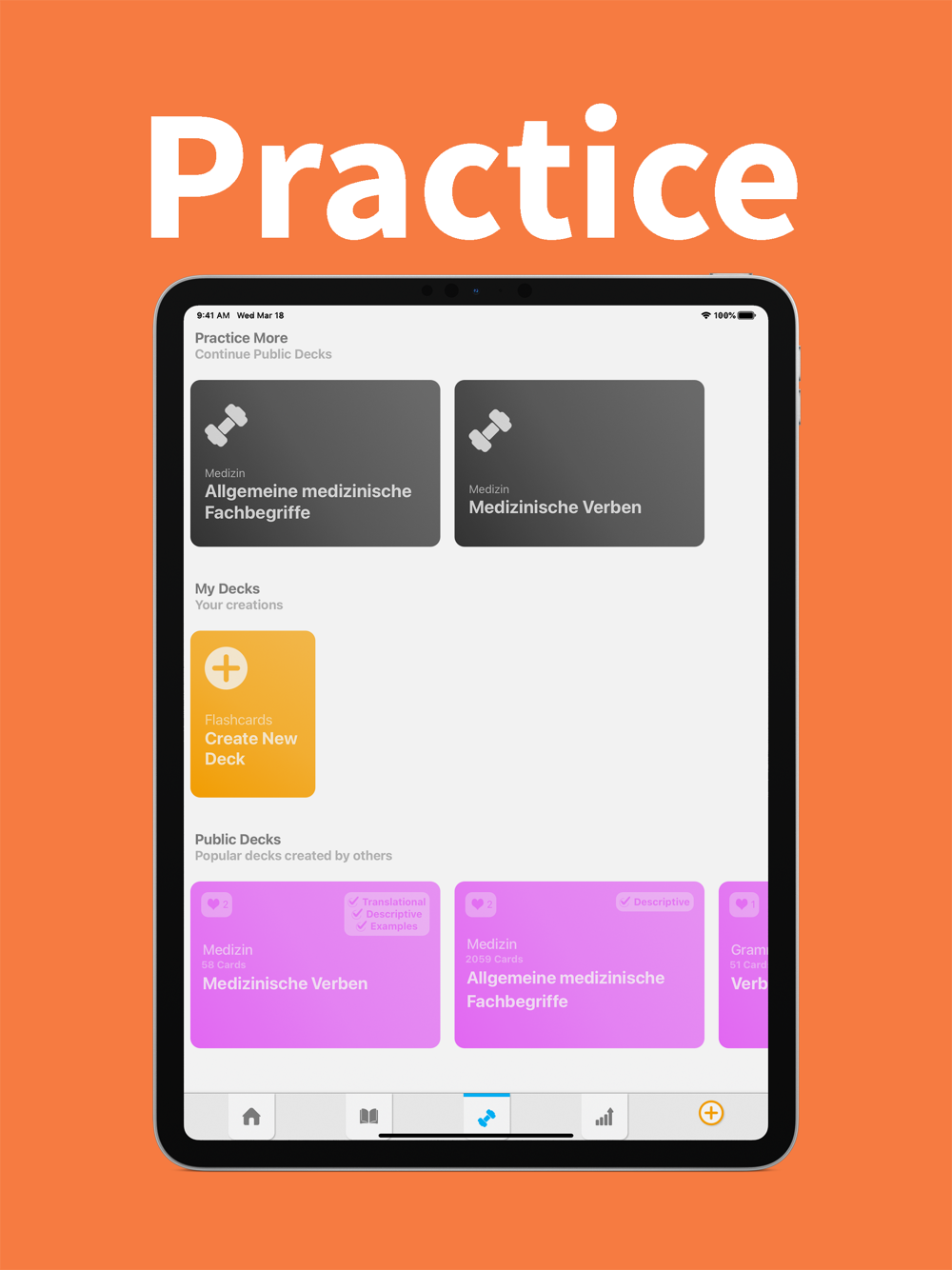 All the words you translate can be made into flashcards, you can revise them in the Practice section, whenever you want.