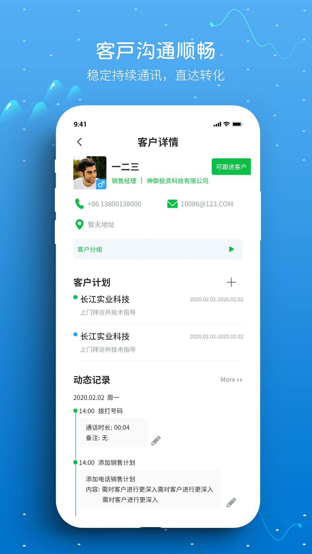 通话录音全程自动保存,通话记录永久跟随客户,通话线路稳定,不会中断,短信触达率高,拜访轨迹可寻,是新一代的销售神器。