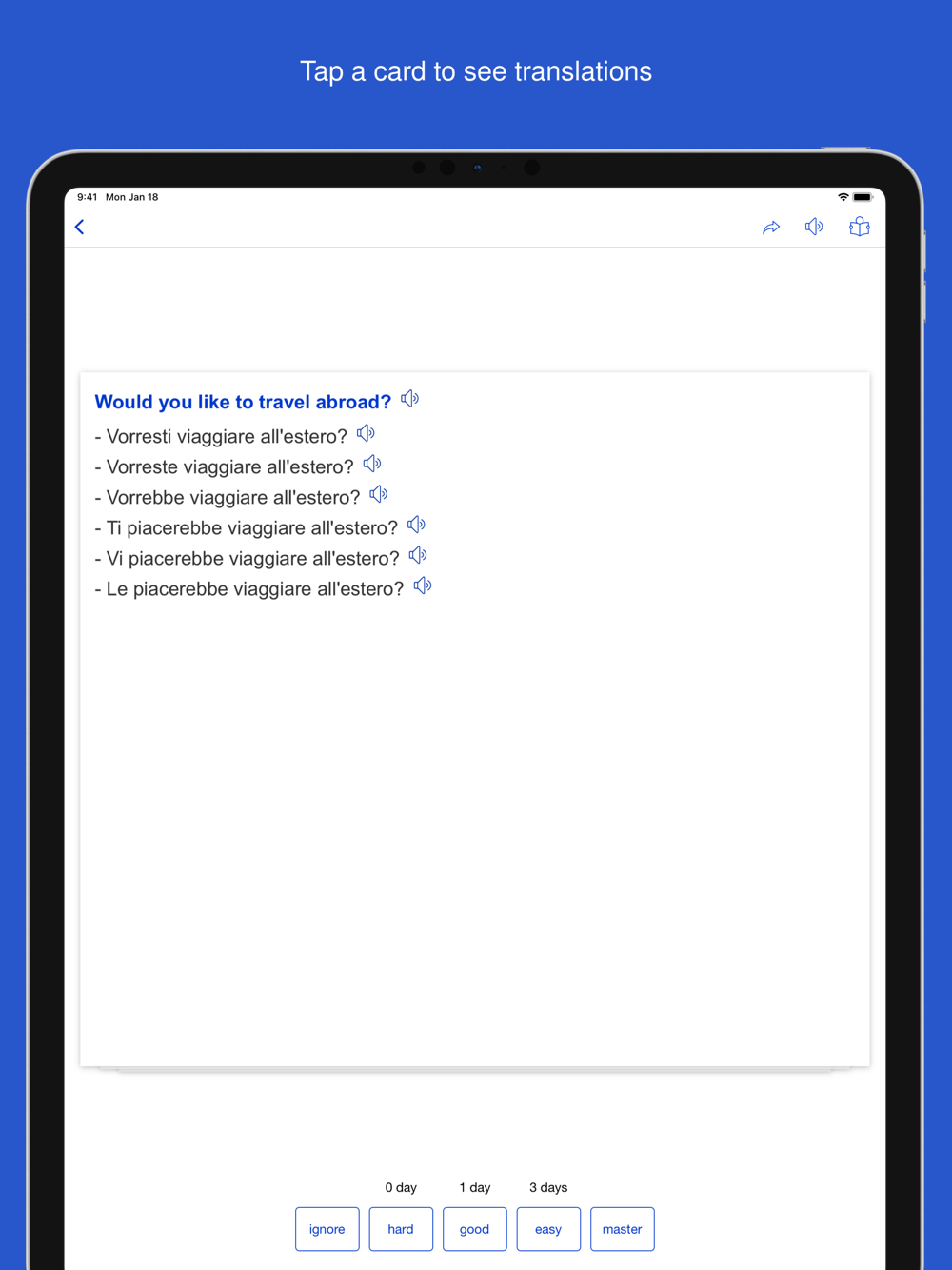 This application is designed to help you learn bilingual English - Italian sentences with spaced repetition flashcards.