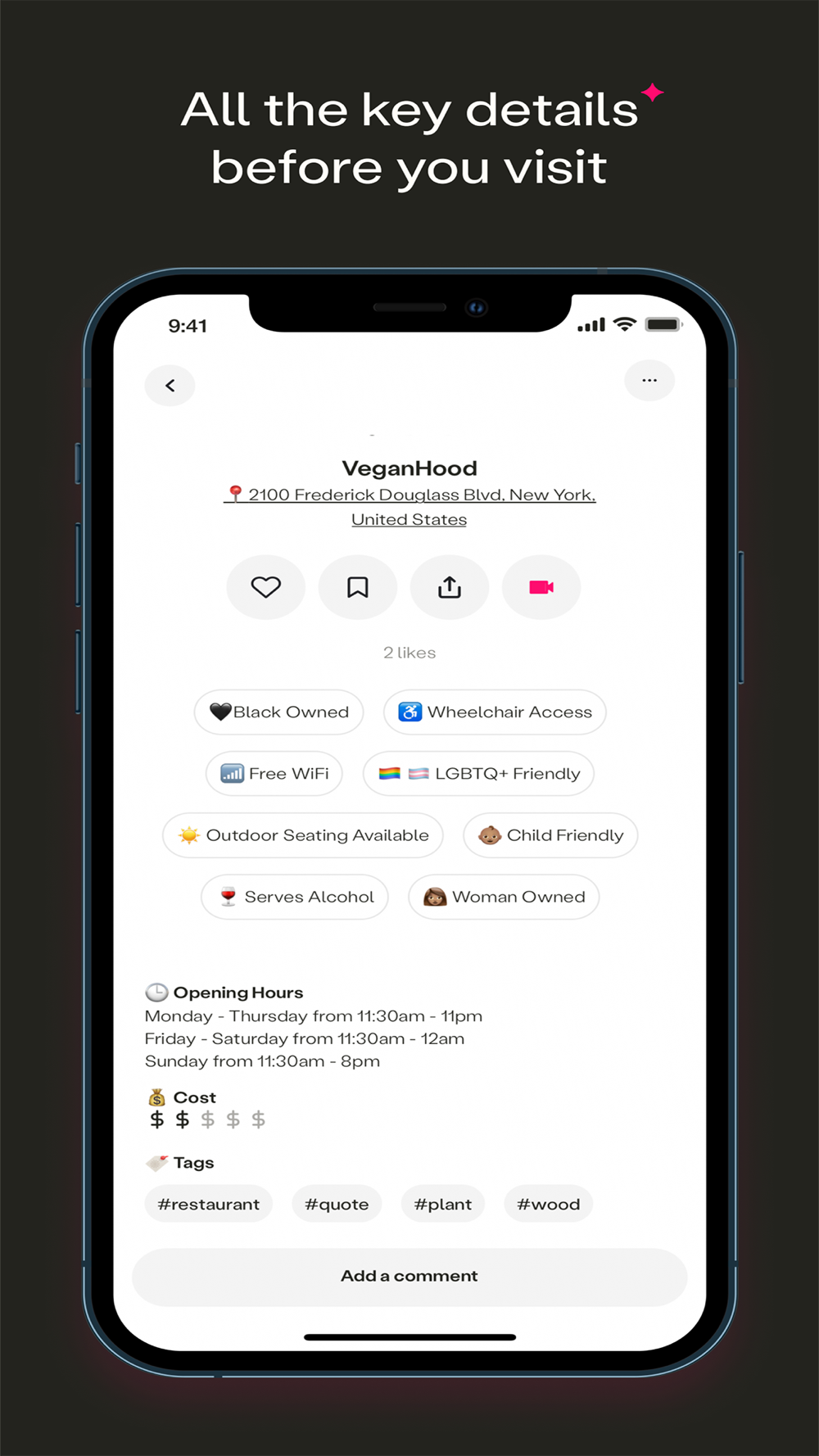 - Get relevant information about a place — from outdoor seating to Wi-Fi — before you visit.