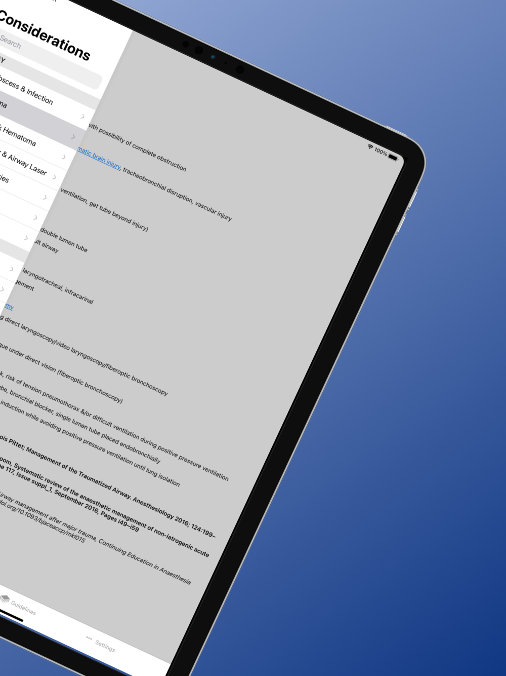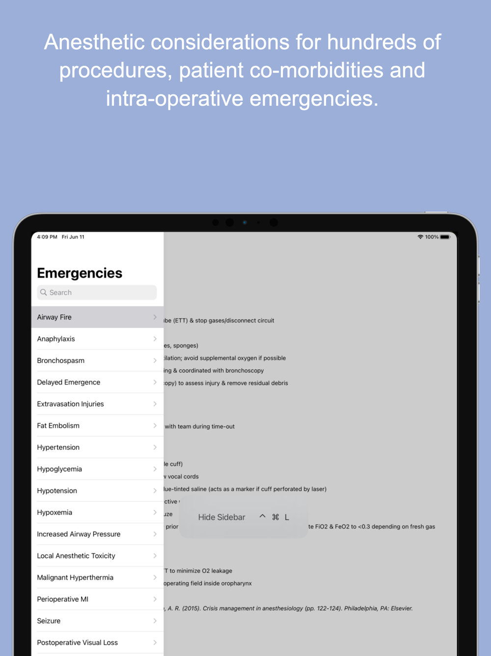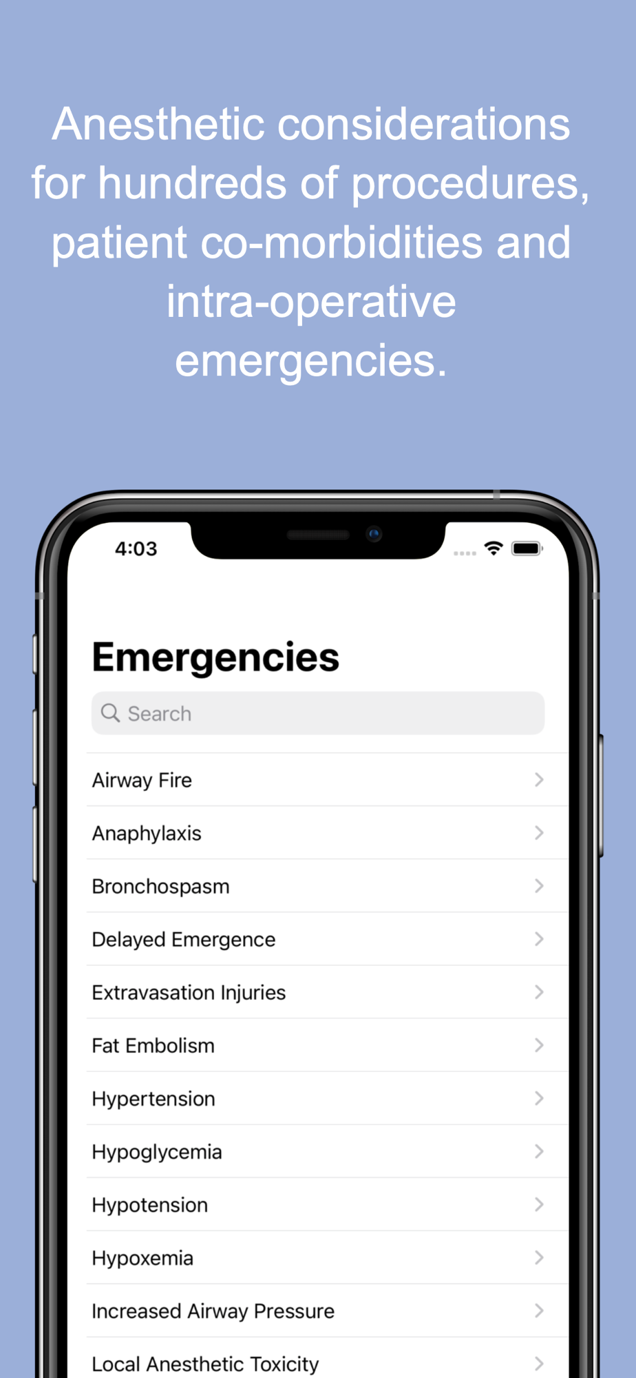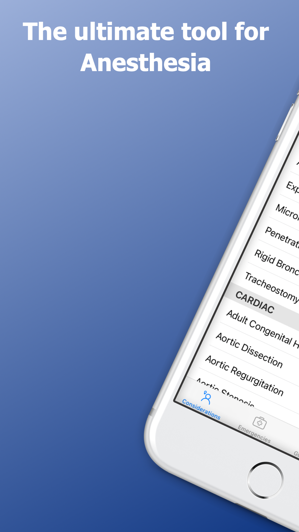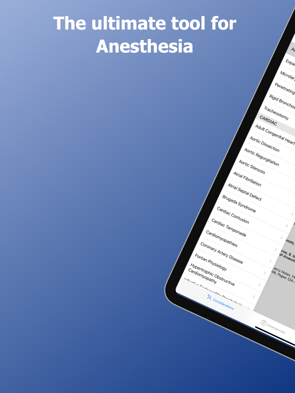This app provides bullet-form, concise and succinct anesthetic considerations for hundreds of procedures, patient co-morbidities and intra-operative emergencies.