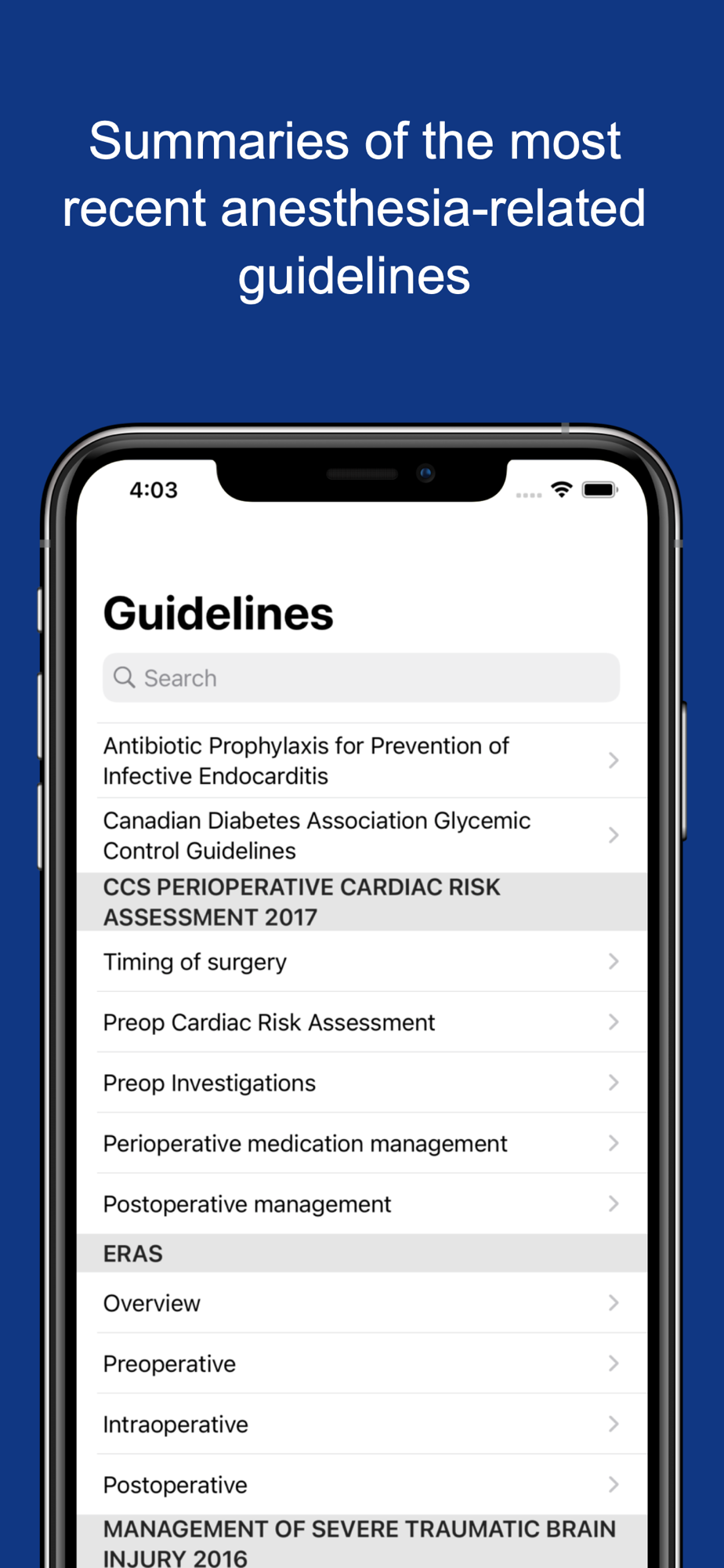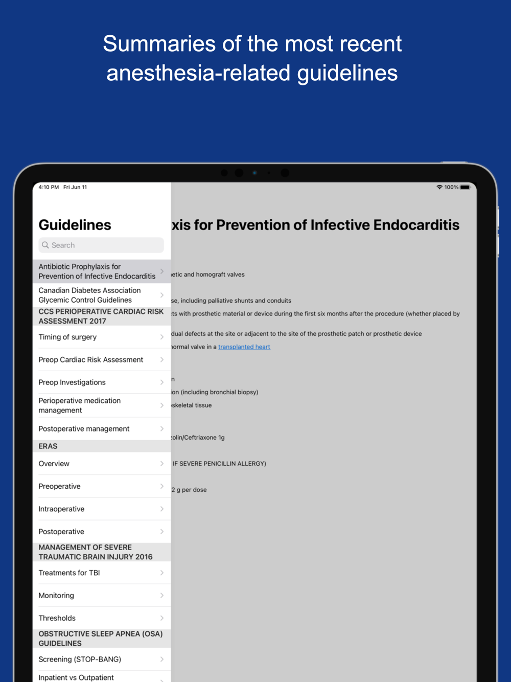 We also provide a summary of the most recent anesthesia-related guidelines such as: ERAS, PONV, OSA and many more.