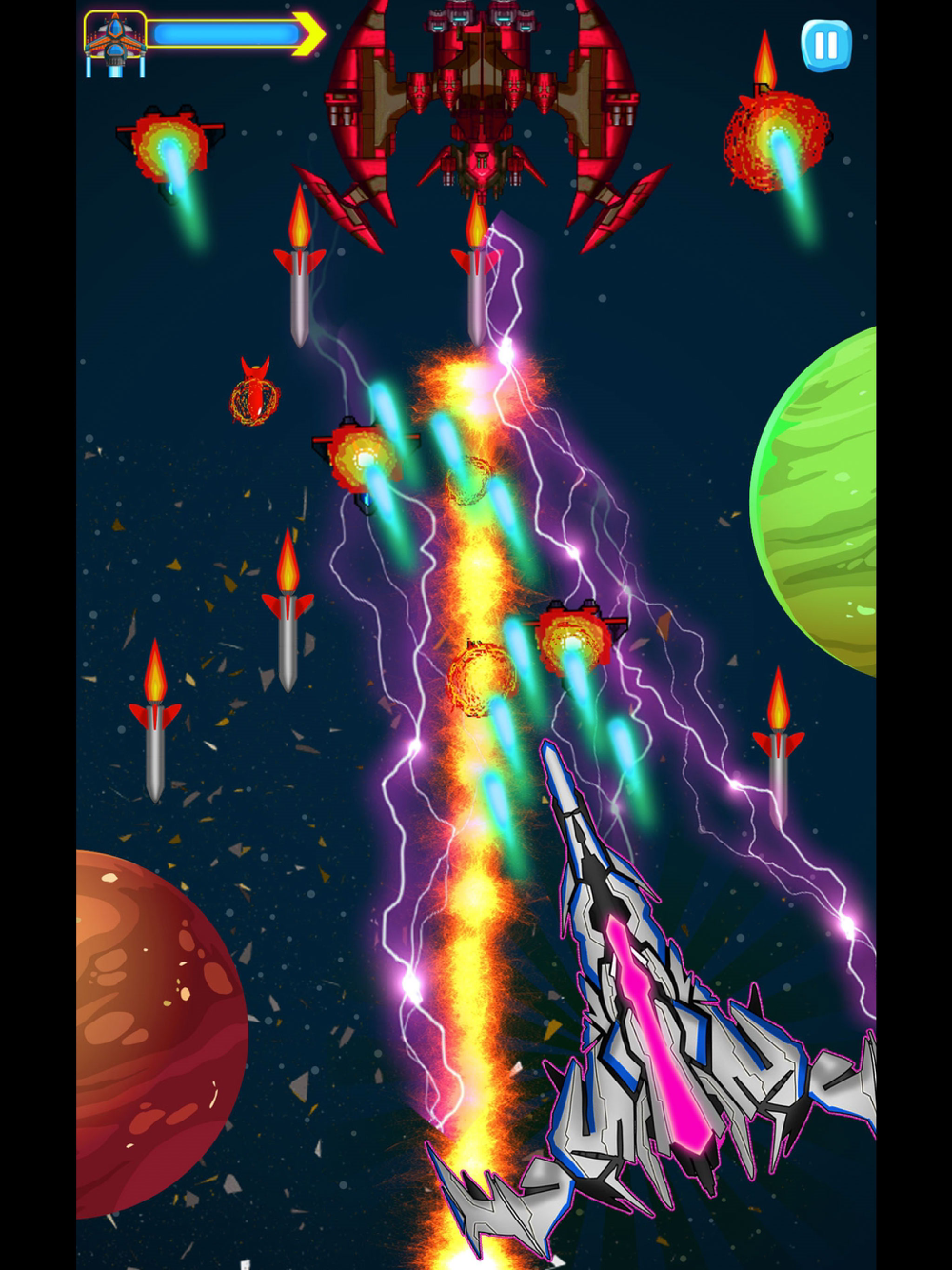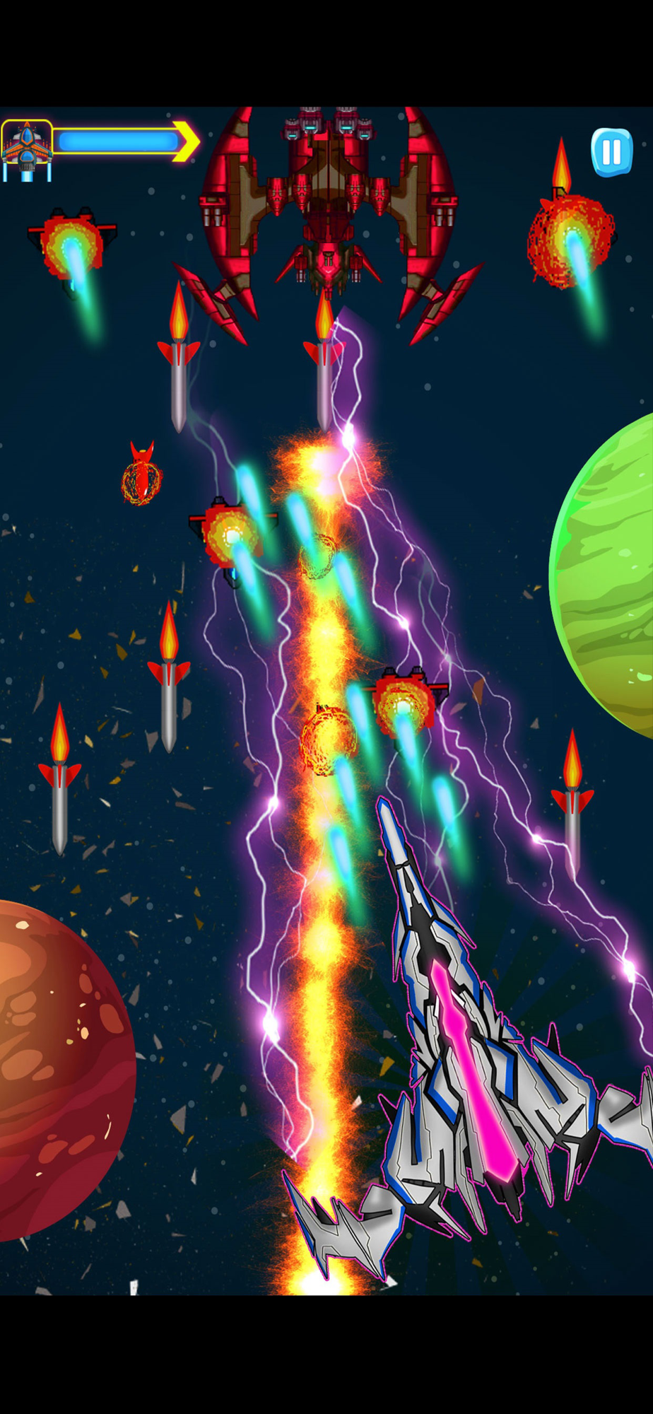 Infinity Space Galaxy Attack: Alien Shooter Games will take you into the front line to fight against alien invaders. Use your rich flight experience to operate your fighter to the left Or move right, up or down to avoid some bullets to keep yourself safe.