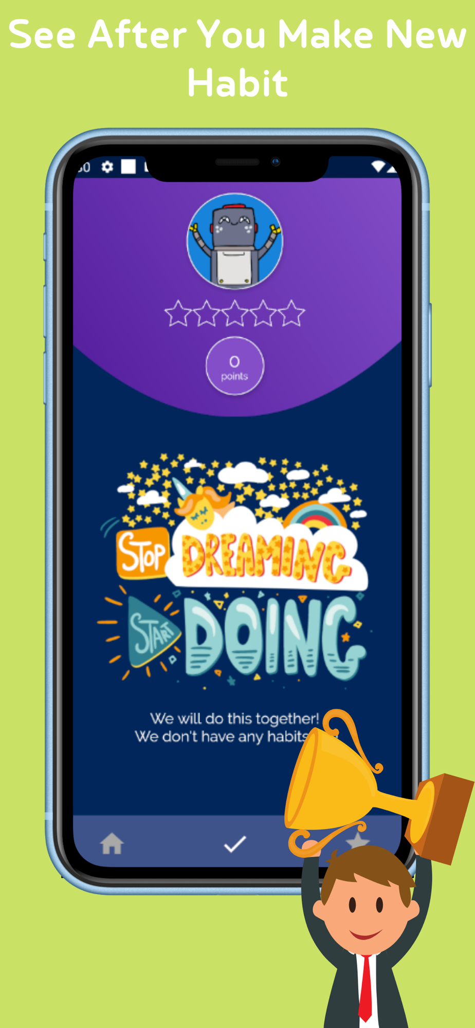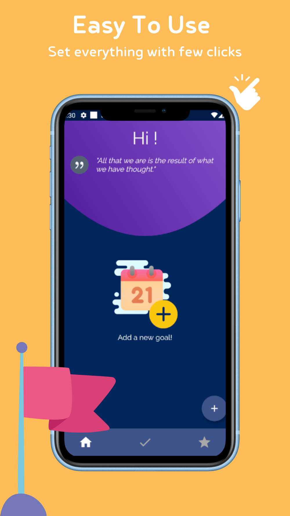 With this idea, we will be working with you to make you new habits. Install Goal 21 Habit app, add your goals with just few clicks, and we will be sending notifications to you at specified time. Everyday you need to check if you did and after 21 days, thats it! You will have new habit and collect points! If you want you can still get notifications for your habits!