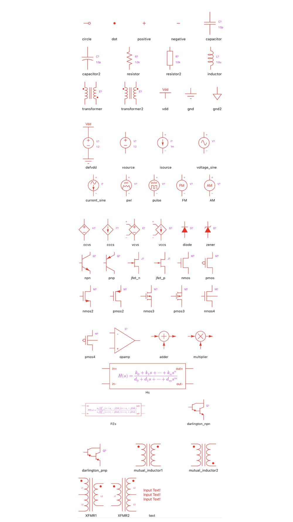 It support: Resistor, Capacitor, Inductor, Voltage source, BJT, MOS, Diode, Zener, ....