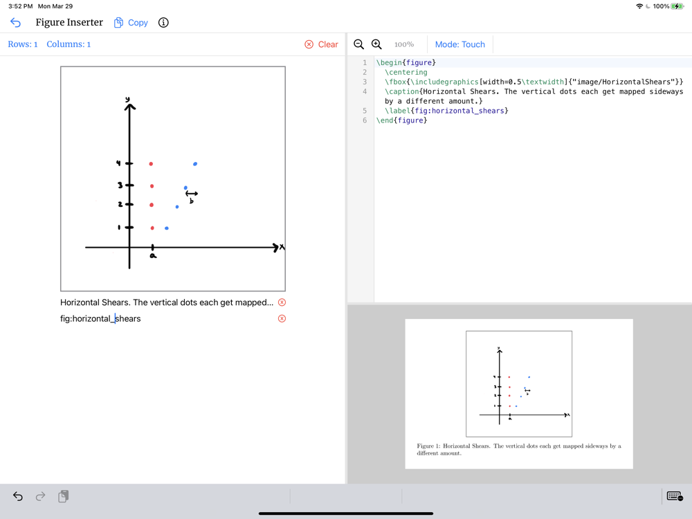 The Figure Inserter allows you to create complex figures with a simple GUI. The changes you make in the GUI are automatically processed in real-time to generate TeX, which is auto-compiled to preview the output figure. The GUI allows you to easily choose the number of subfigures and add captions and labels. It allows you to import images from your camera, device, iCloud, and more. It also allows you to simply draw your own images with your fingers, or Apple Pencil if you have one, and then import them directly into your project. These drawings can later be modified to create other drawings or update existing ones.