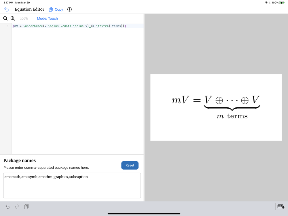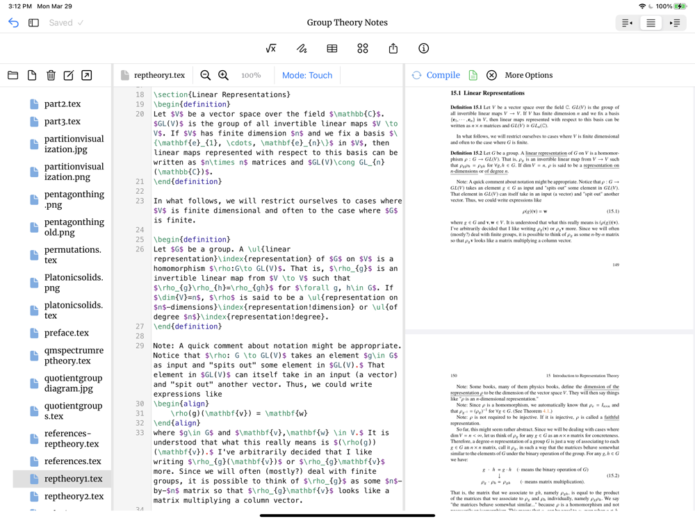 TeXable comes with a text editor that has syntax highlighting, autocompletion based on the packages you’ve added, search and replace, and more. It compiles LaTeX locally using PDFLaTeX, allowing you to compile swiftly and get instant feedback. The TeXLive distribution is downloaded as an on-demand-resource after the app is installed for a smoother experience. It is quite large, at around ~760MB.