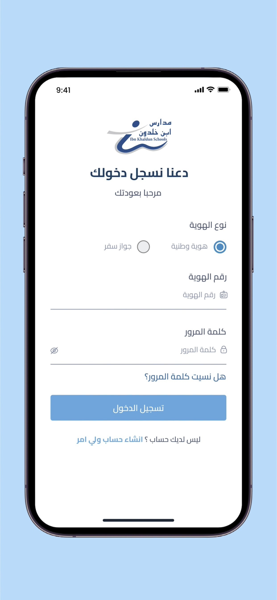 تطبيق تعليمنا لمدارس ابن خلدون يقدم تجربة فريدة لأولياء الامور تمكنهم من إدارة انشطة وحسابات ابناؤهم في مدارسنا ويجمع كل احتياجات ولى الامر تحت مظلة واحدة. يمكن الان لولى الامر عبر التطبيق التقديم للقبول في مدارسنا ومراقبة وإدارة المدفوعات والمصاريف وتحديد النقل المدرسي والخدمات المساندة ورفع الوثائق واستقبالها.
