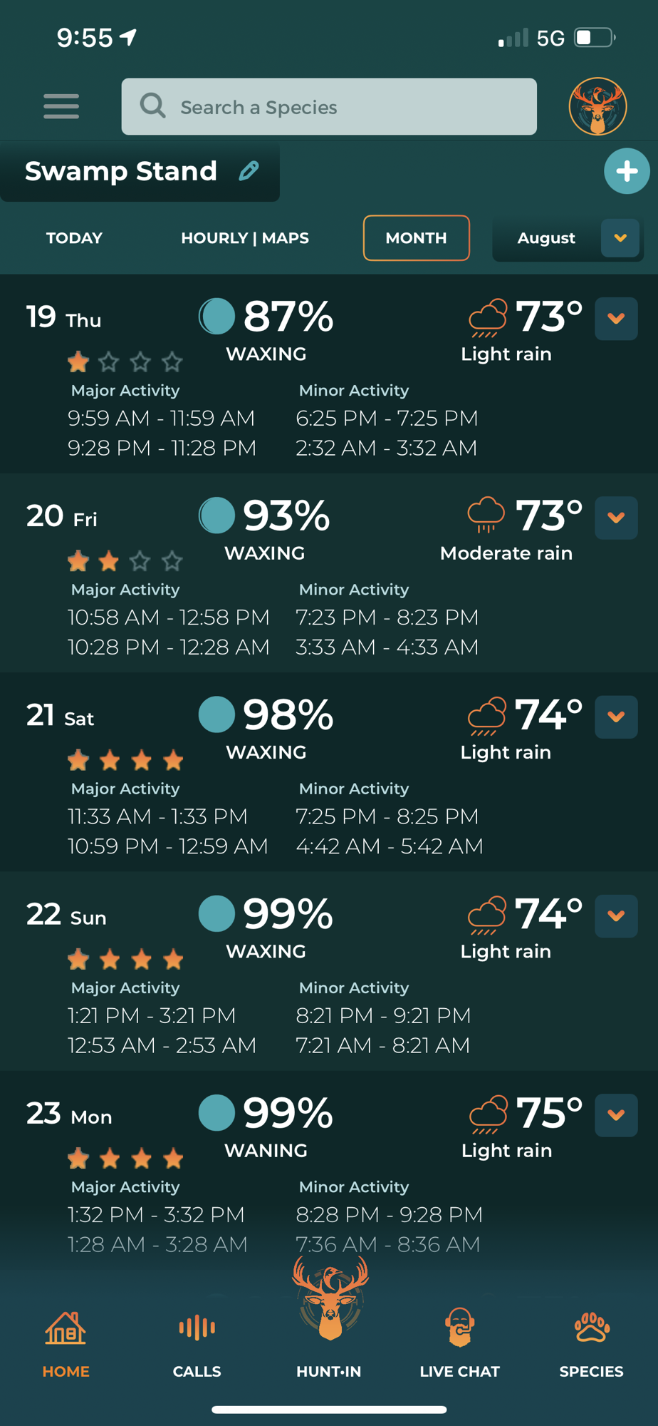 Plan your hunt with precise hourly and monthly forecasts. HUNT·IN shows ideal shooting directions for all your favourite spots & stands, specific to your targeted game! Pair solunar data with major & minor feeding times to optimize your time in the woods!