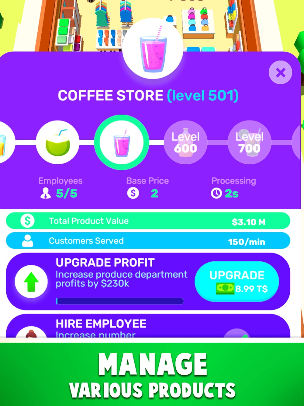 If your favorite game is idle and management, you will enjoy a real moment of becoming the best manager in the world in this mall tycoon game. You can easily run your own Retail Empire with different stores and various products. Make important management decisions to build your mall empire and grow your small shop into a huge retail empire!