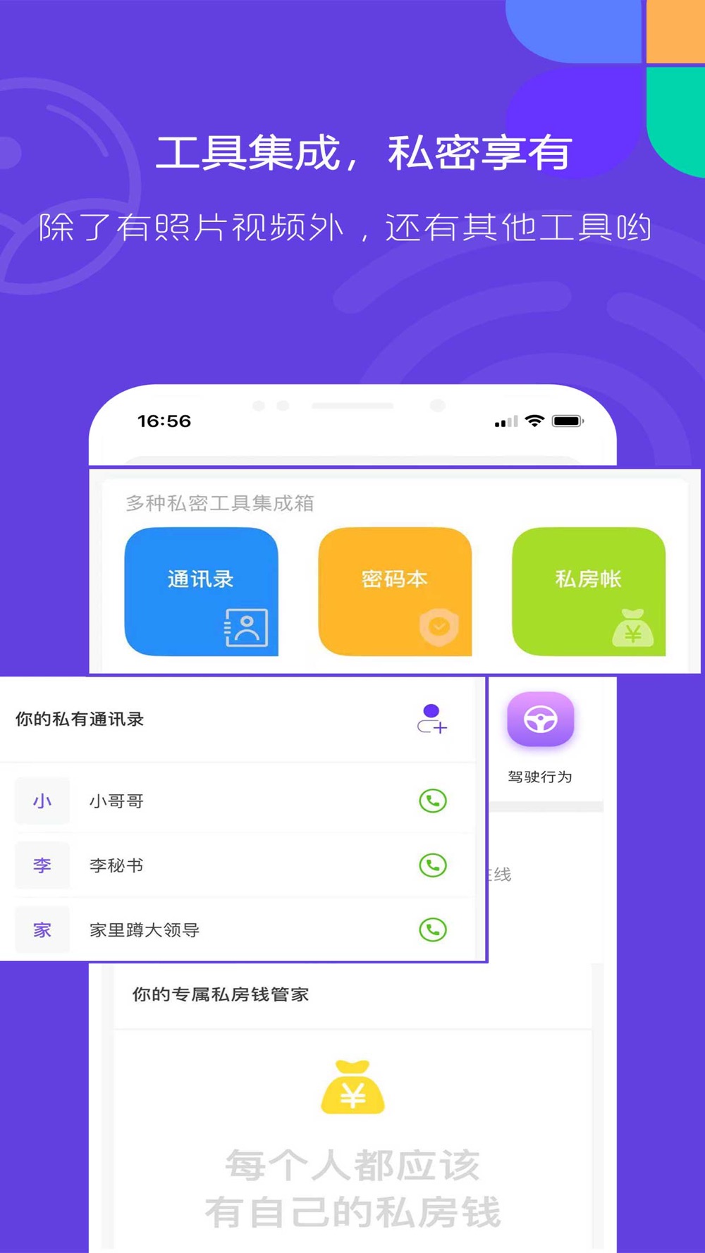 ■私密相册:支持新建多个专辑,可无限添加手机本地照片,支持快捷添加私密照片,支持幻灯片浏览,不压缩质量,不失真的隐藏相册