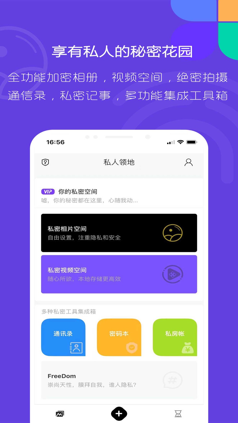 私人领地是一种安全专业的加密视频相册专享软件,可以添加私密照片和视频加密隐藏,可以直接私密拍摄和视频,可以以文本和语音的形式记录私密心声,可以存储和拨打私密电话,还包括后续的密码管理和个人私房帐等功效。