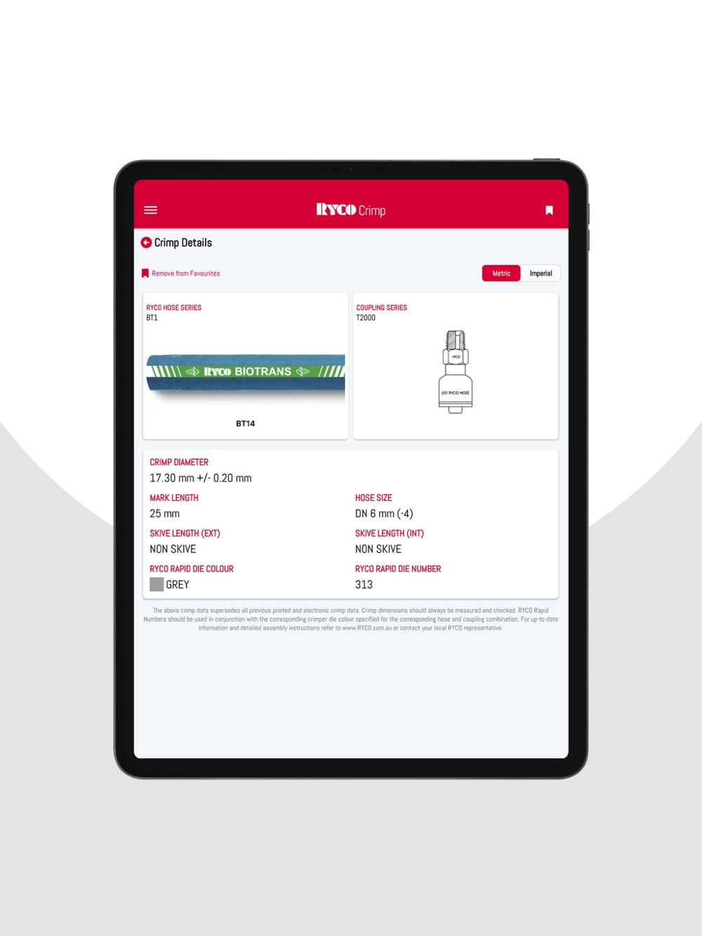 RYCO Crimp is your source for RYCO crimp specifications. Find the most up-to-date specifications to accurately and safely crimp RYCO hydraulics hoses with matched RYCO fittings. This intuitive application enables you to get your crimp specifications within your very own workshop or in your mobile service truck using your tablet or mobile phone device!