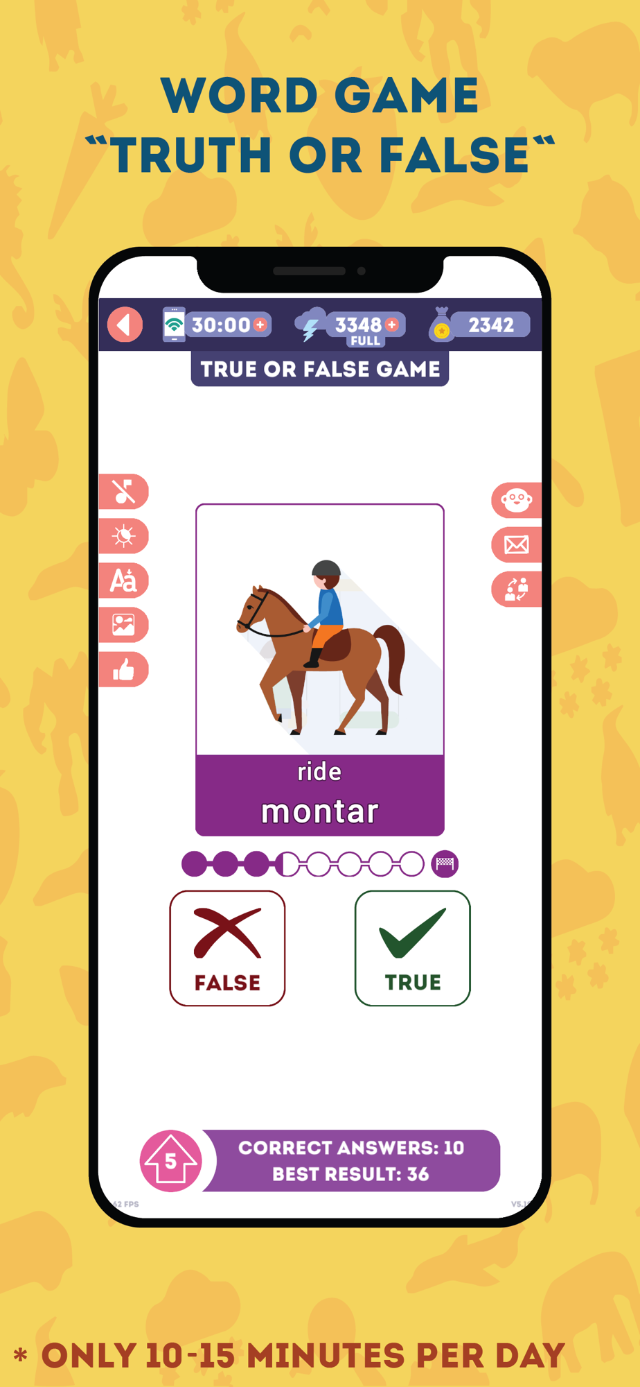 Review Past Material - Many good apps do not pay enough attention to review past material! For this purpose we created the word game "True or False". It is very simple, but it's addictive and the most importantly, it helps to repeat past material and never to forget it!
