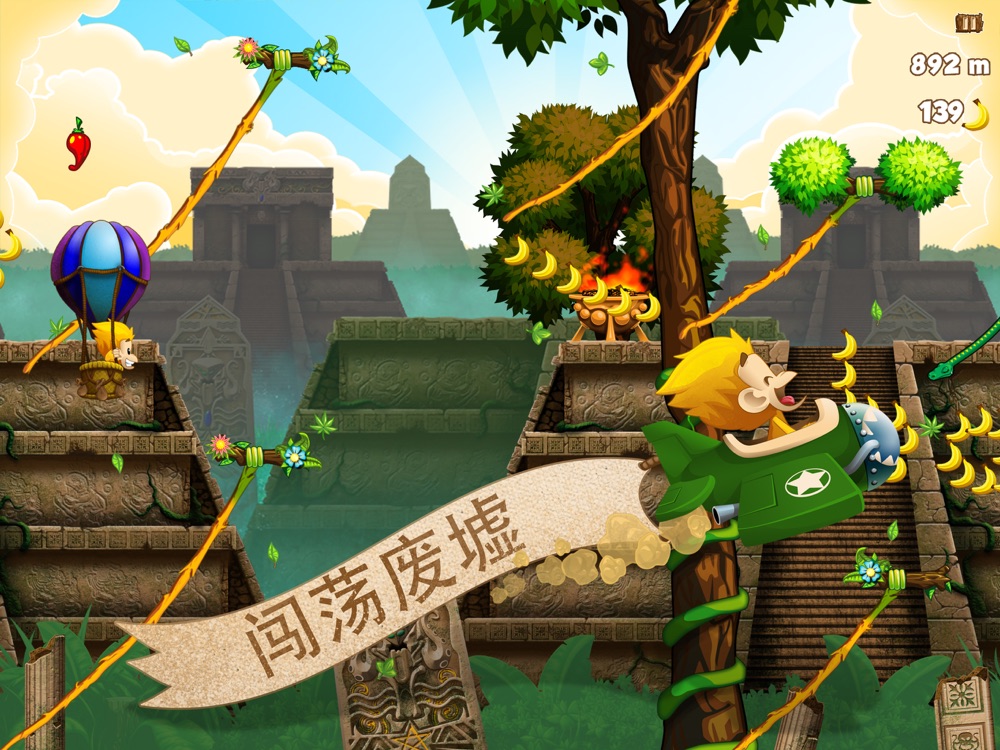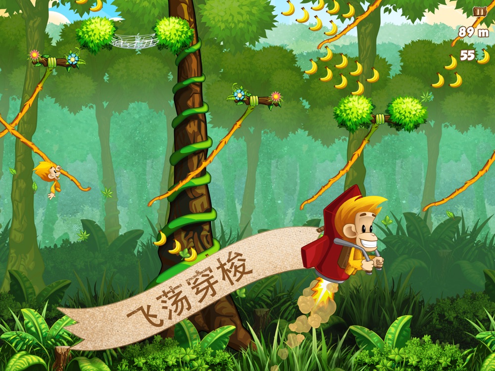 一只小猴在藤蔓间敏捷地飞荡着,小心!注意潜伏在丛林中的危险。获取香蕉进行升级、购买道具和体力等。