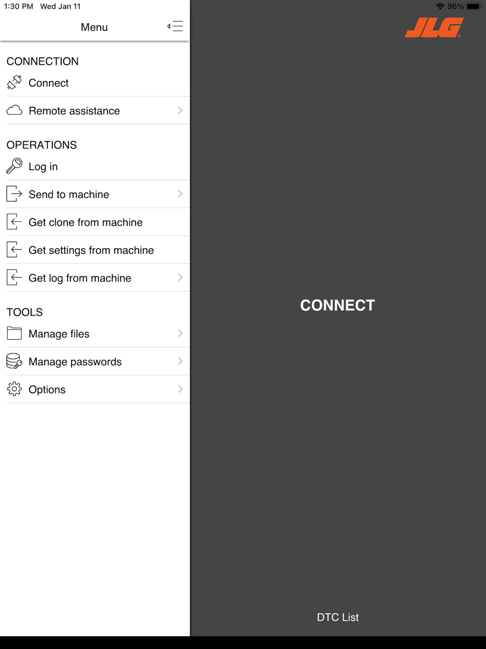Use your smartphone as a "modem" to connect your machine to the Internet. This feature allows remote personnel, such as JLG service call-center technician to perform operations such as fault finding, software updates, configuration, calibration, and more, via the Internet.