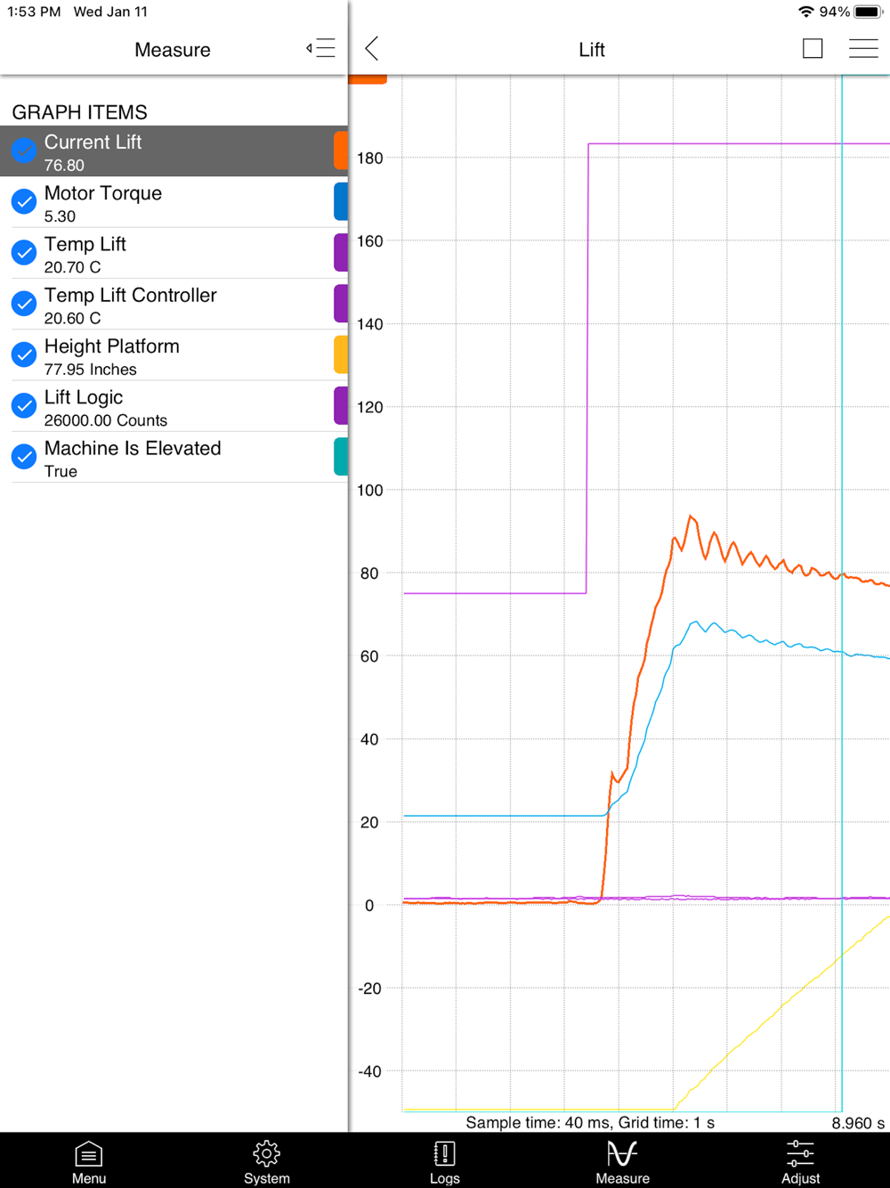 Connect via Bluetooth to your AE1932 scissor lift. All the data you see is live and in real-time.