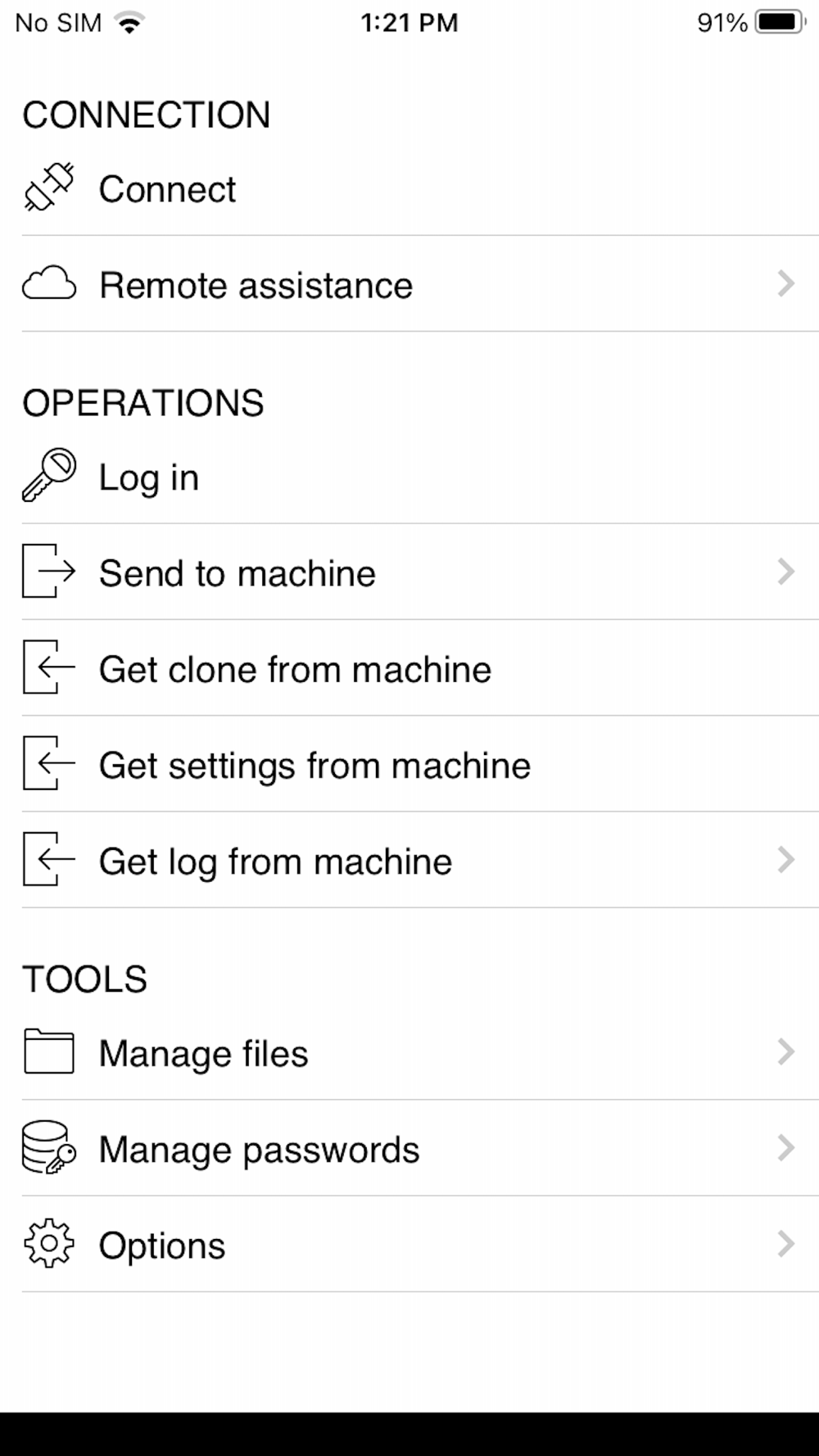You can perform actions such as "Log in" which unlocks features based on access level. "Send to machine" or "Get from machine" features allow service technicians to send or get software updates and machine settings without the need of a computer.