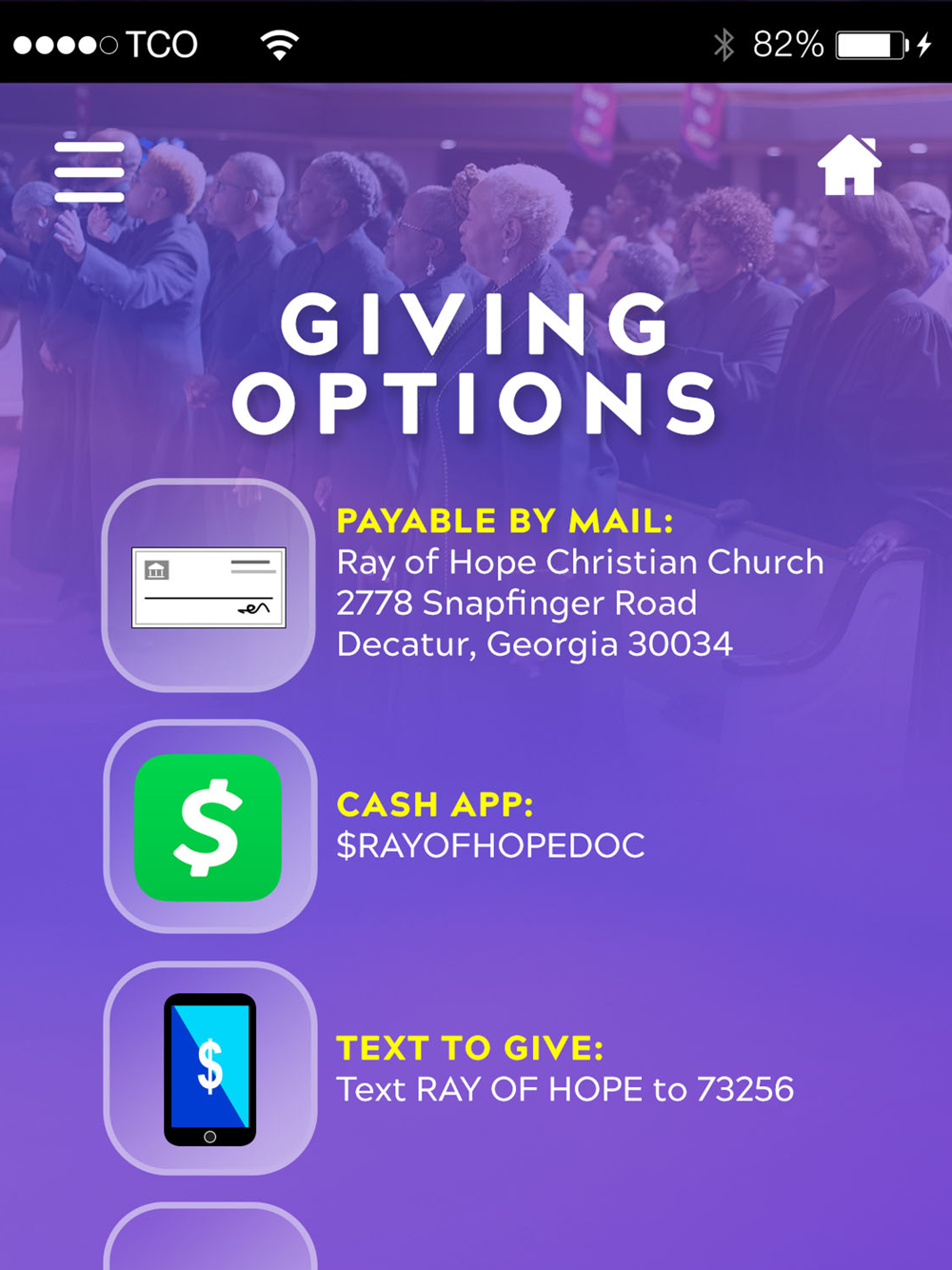 This is the official Ray of Hope Christian Church iPhone/iPad/iPod Touch Application. Download this FREE App today to connect with Ray of Hope Christian Church and experience our messages. Watch our services LIVE, listen to music and more. The Ray of Hope Christian Church App was created by The Church Online. of Hope Christian Church in 2778 Snapfinger Road Decatur, Georgia 30034