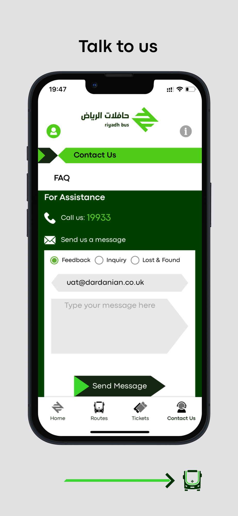 Contact us – users can send feedback, inquiry, or lost & found messages to the riyadh bus Customer Care team.