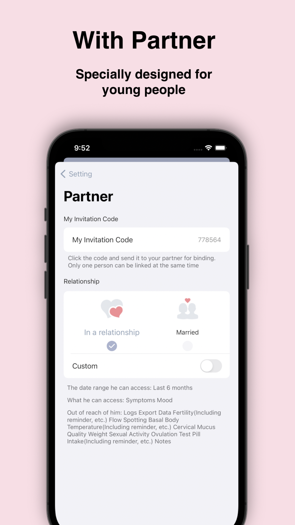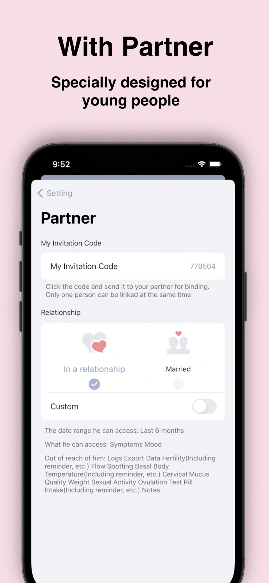 ● Connect to partner's account, customize your partner's permission. Predict ovulation day and fertile days to assist you in planning your own pregnancy plan or contraceptive plan